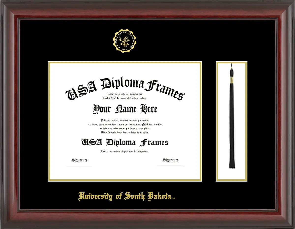 University of South Dakota Diploma Frame with Tassel – Cherry Mahogany Glossy – Black and Gold Mat