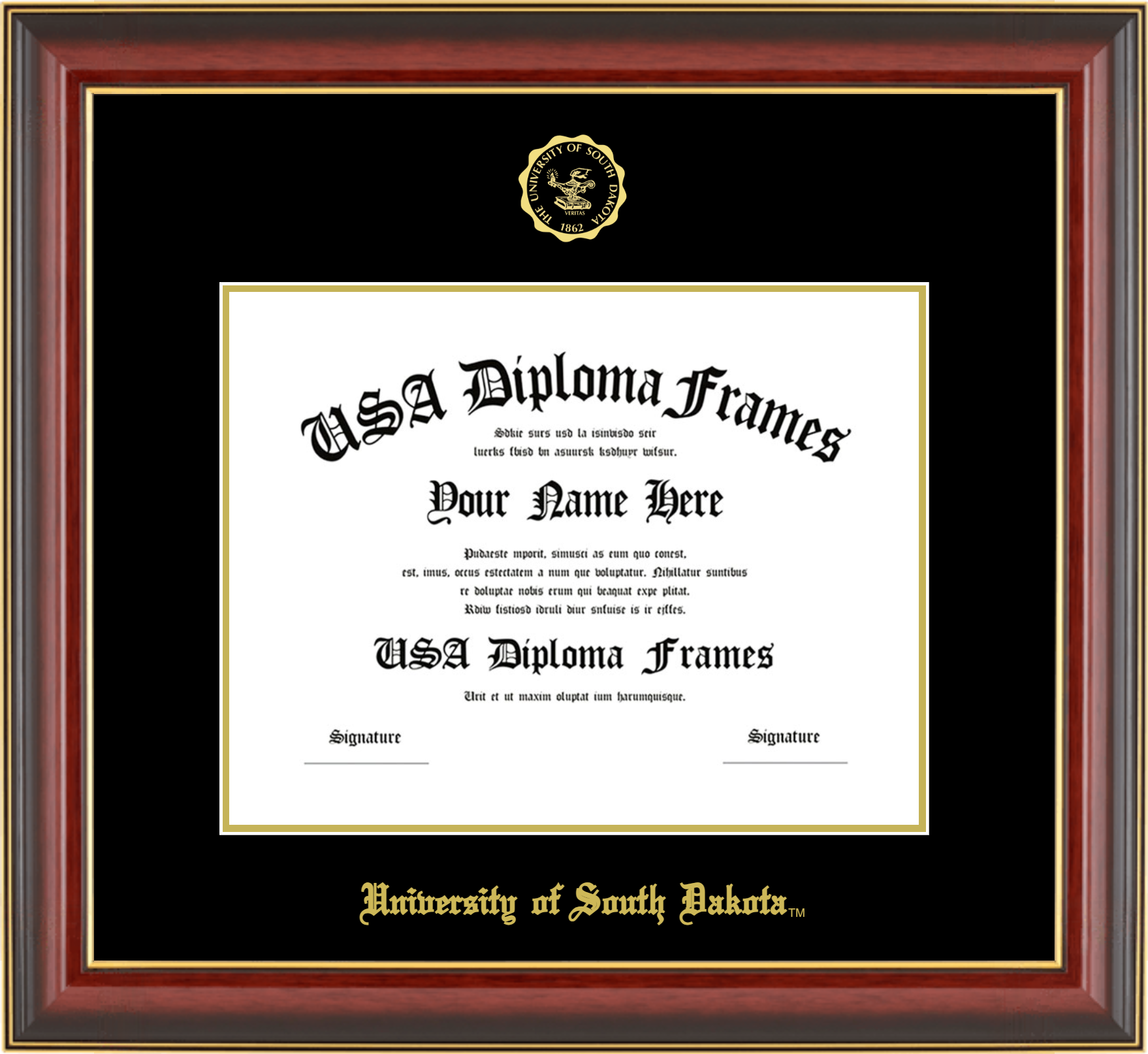 University of South Dakota Diploma Frame – Cherry Mahogany Gold Trim Glossy – Black and Gold Mat