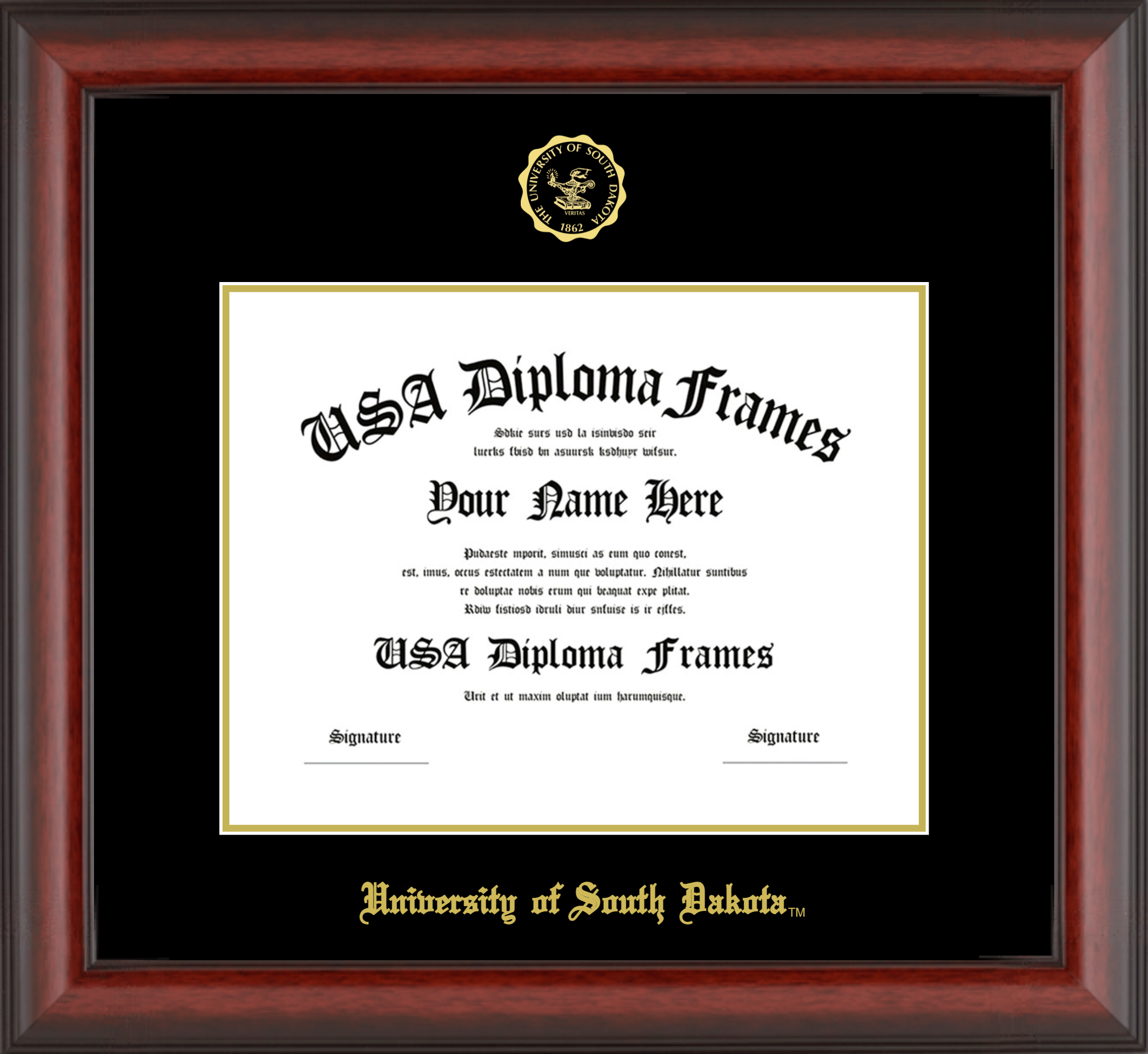 University of South Dakota Diploma Frame – Cherry Mahogany Matte – Black and Gold Mat