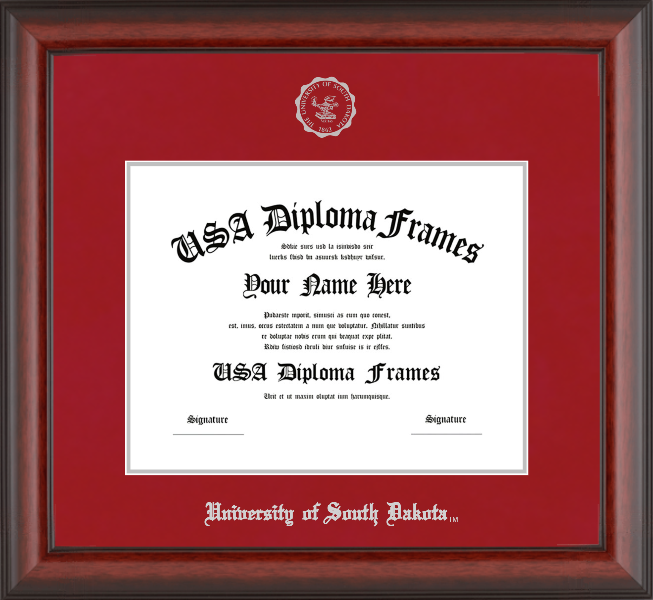 University of South Dakota – Single Horizontal Document ( Diploma ) – Cherry Mahogany Matte – Crimson Mat – Silver Accent Mat – With Seal(University Seal) – With Silver Embossing (University of South Dakota)