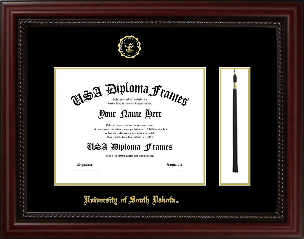 University of South Dakota Diploma Frame with Tassel – Executive Cherry Rope – Black and Gold Mat