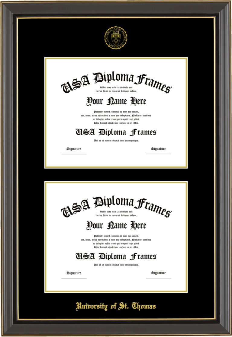 University of St. Thomas Double Diploma Frame – Double Document – Black Gold Trim Glossy – Black and Gold Mat