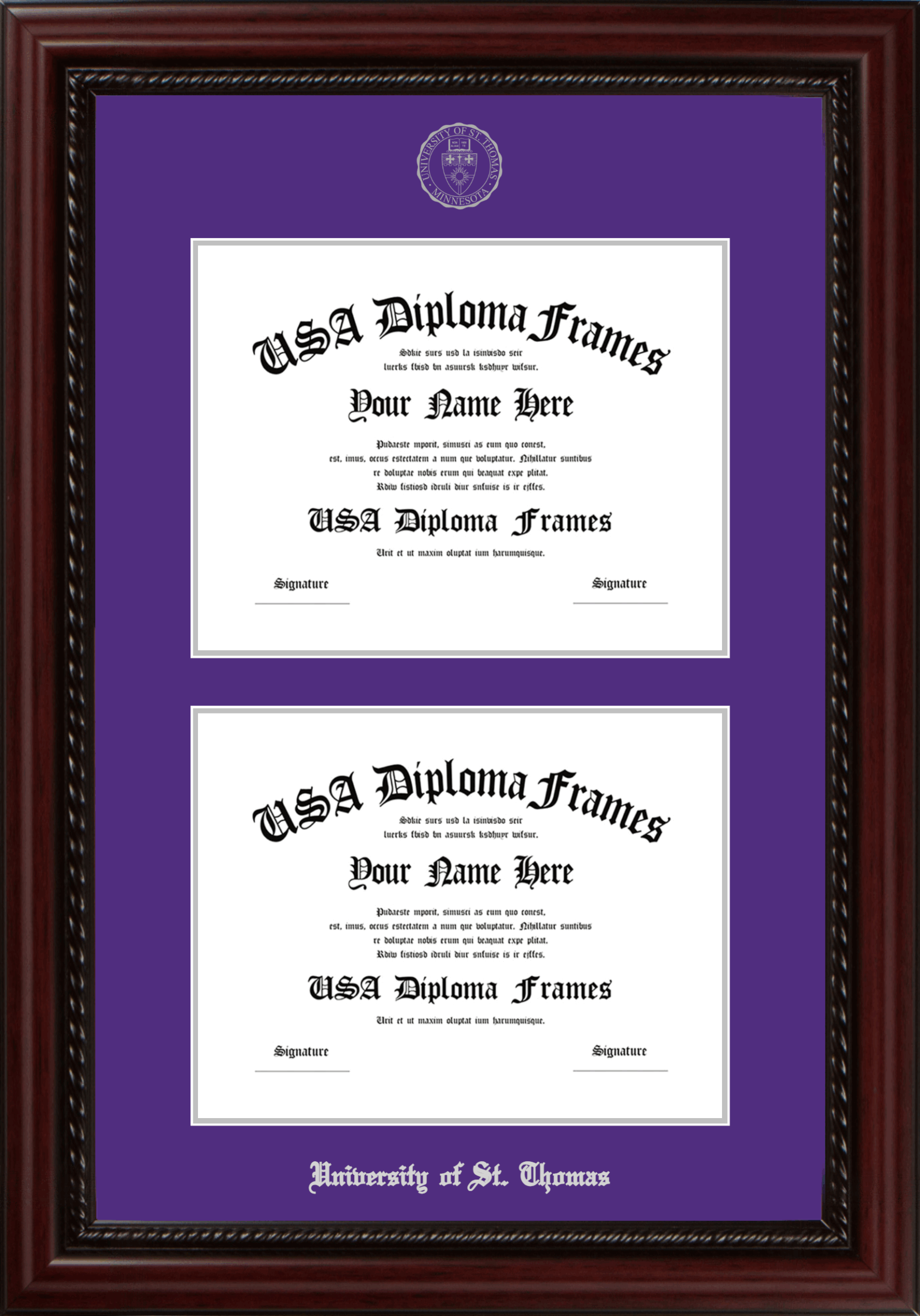 University of St. Thomas Double Diploma Frame – Double Document – Executive Cherry Rope – Purple and Silver Mat