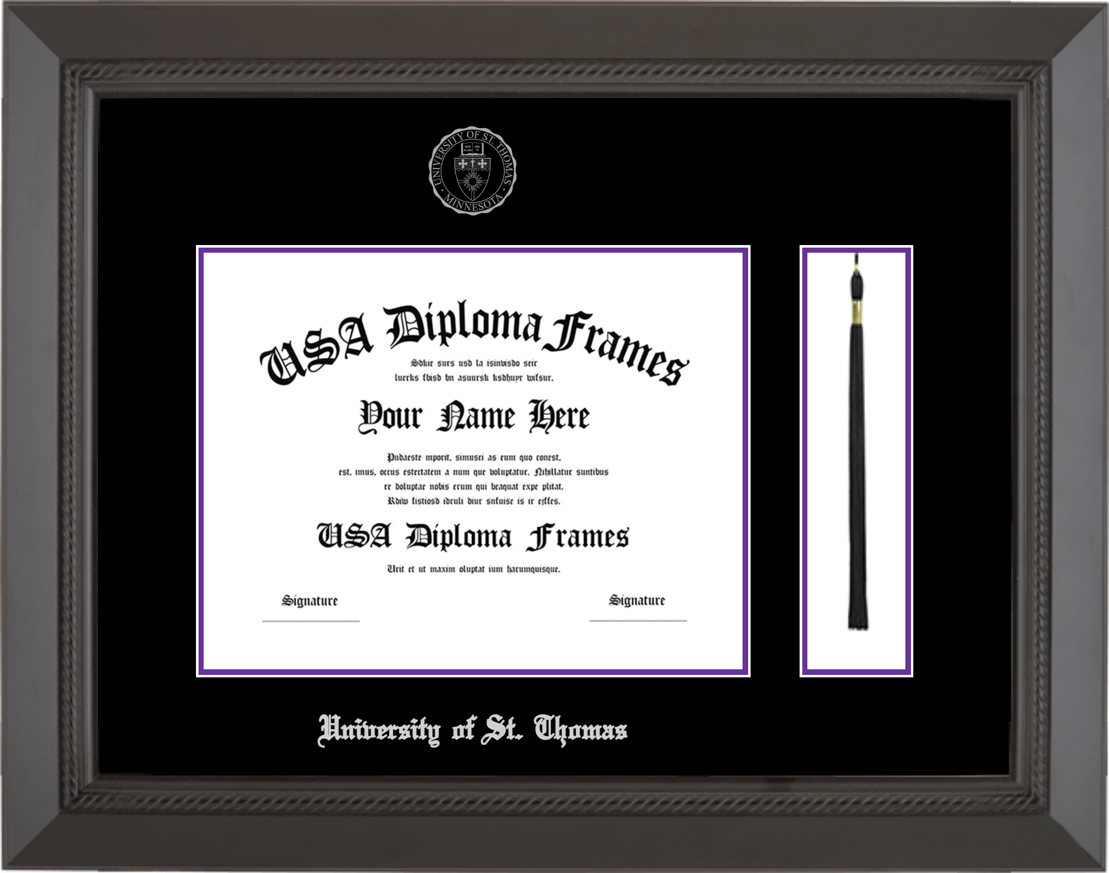 University of St. Thomas Diploma Frame with Tassel – Black Rope – Black and Purple Mat – Silver Seal