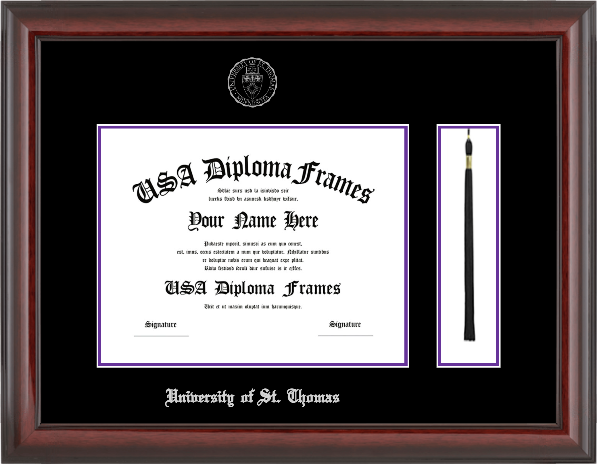 University of St. Thomas Diploma Frame with Tassel – Cherry Mahogany Glossy – Black and Purple Mat – Silver Seal