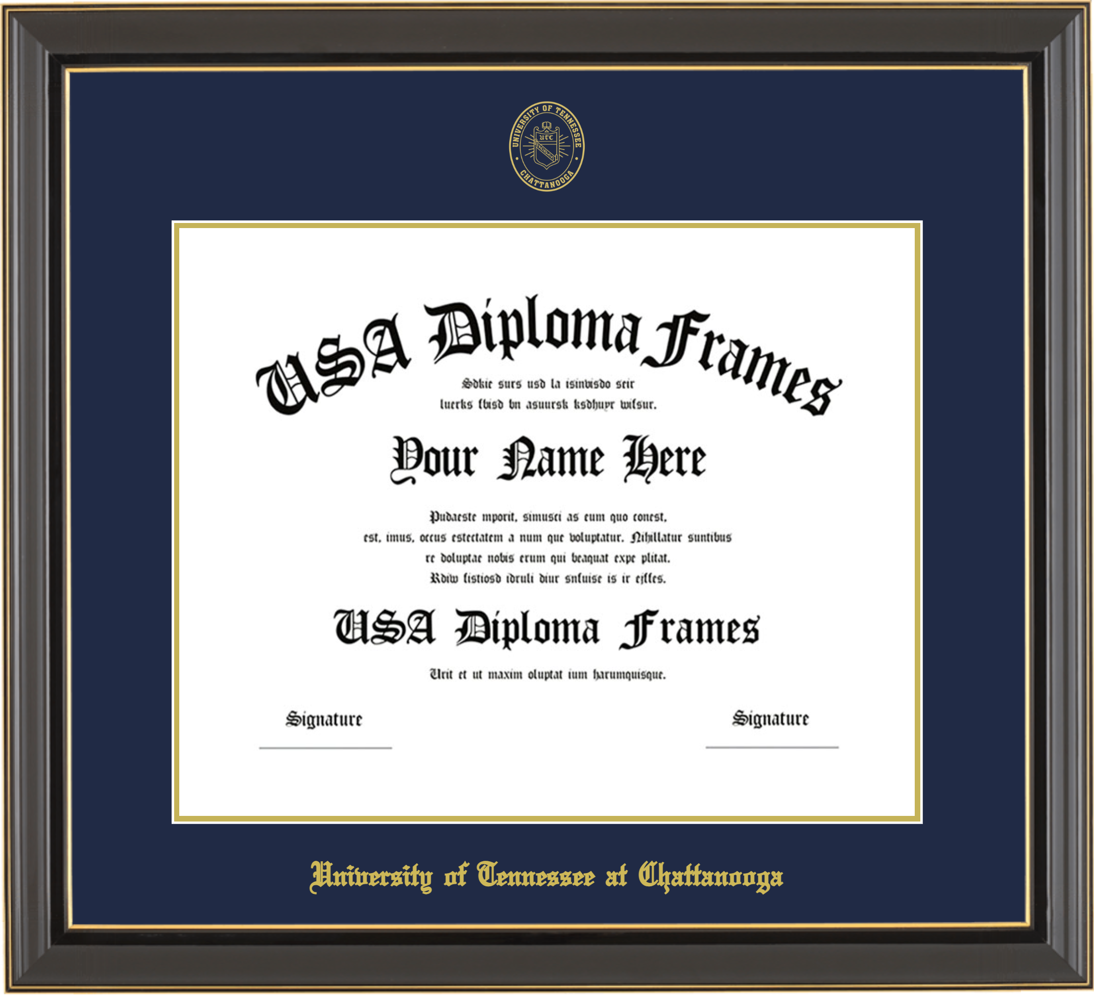 University of Tennessee at Chattanooga – Single Horizontal Document ( Bachelors/Masters ) – Black Gold Trim Glossy – Navy Mat – Gold Accent Mat – With Seal(University Seal Gold) – With Gold Embossing (University of Tennessee at Chattanooga)