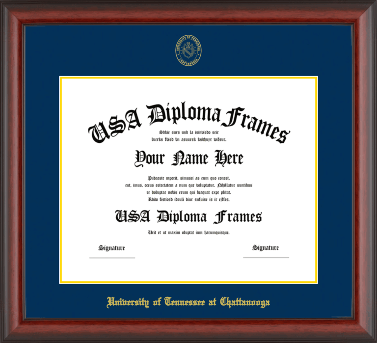 University of Tennessee at Chattanooga Diploma Frame – Cherry Mahogany Matte – Navy and Yellow Gold Mat – 12×15