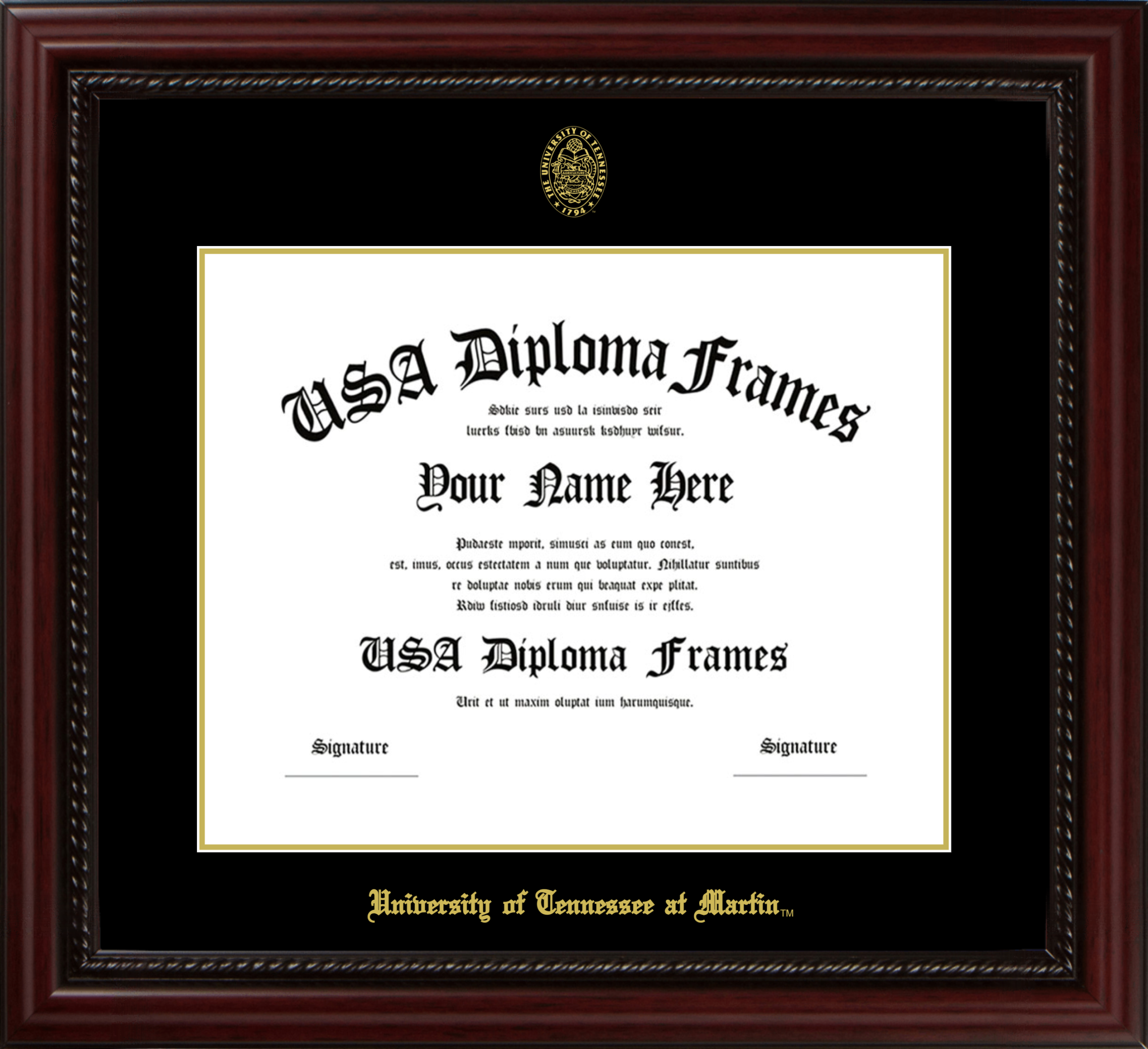 University of Tennessee at Martin Diploma Frame – Executive Cherry Rope – Black and Gold Mat