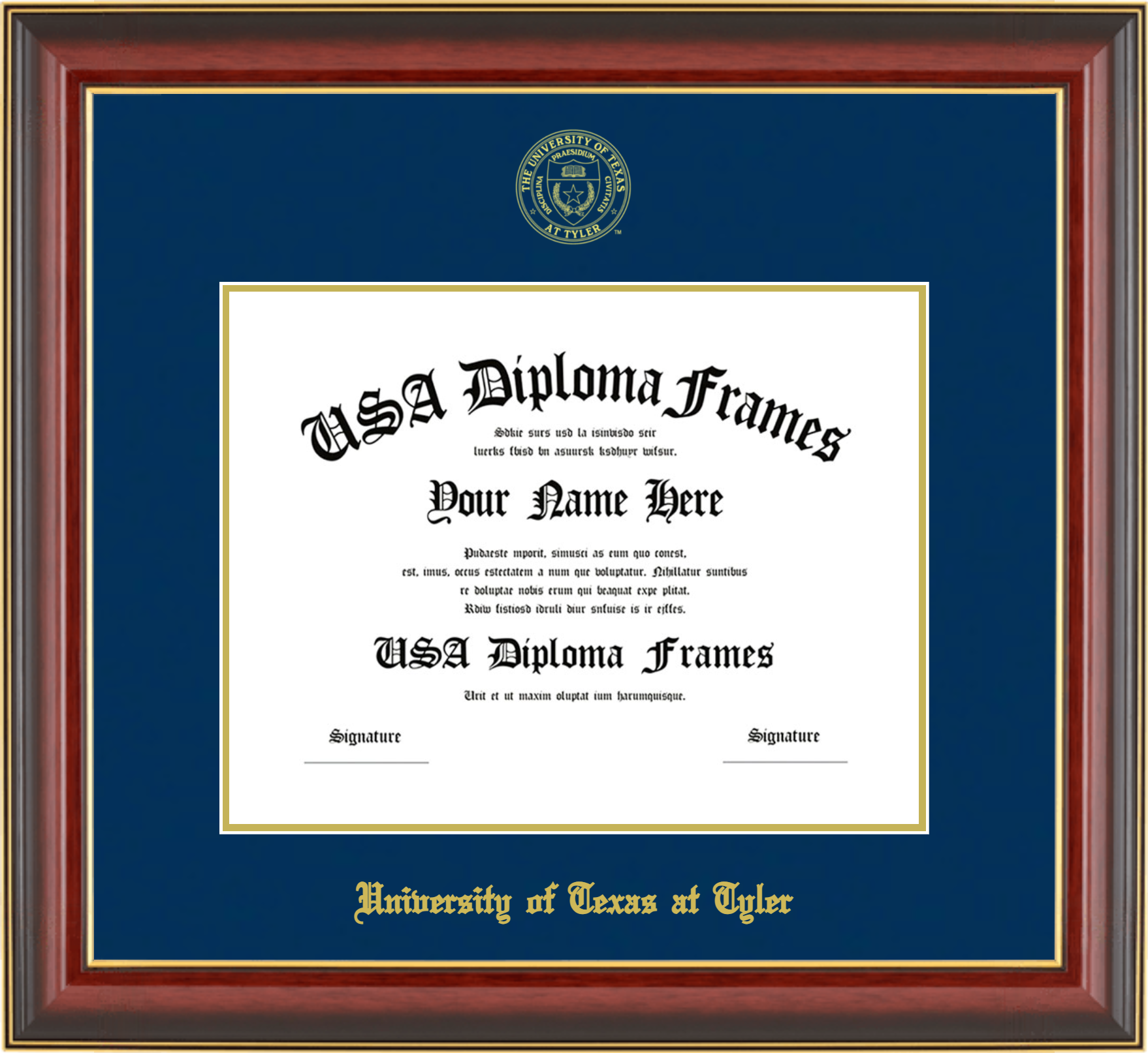 University of Texas at Tyler Diploma Frame – Bachelors 8.5×11 – Cherry Mahogany Gold Trim Glossy – Navy and Gold Mat