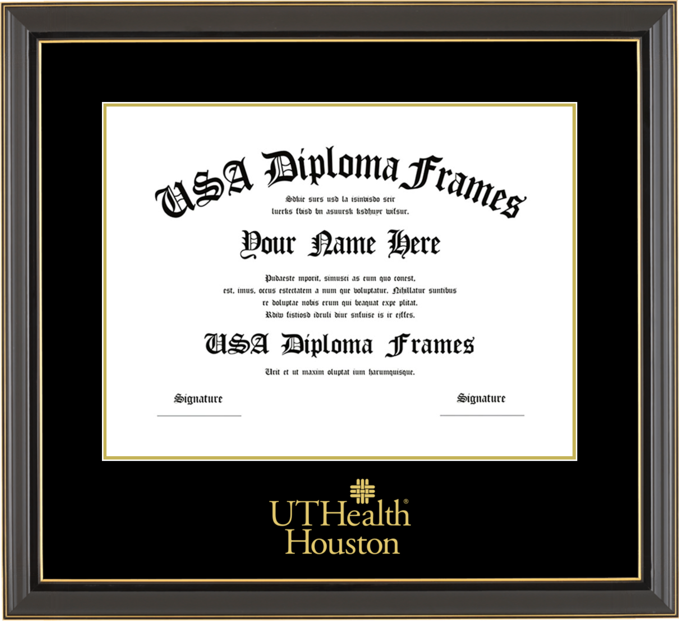 University of Texas Health Science Center at Houston – Single Horizontal Document ( Diploma ) – Black Gold Trim Glossy – Black Mat – Gold Accent Mat – With Image Embossing(Gold)