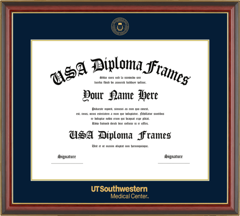 Want to explore more styles? Browse our full range of diploma frame layouts, or visit the The University of Texas Southwestern Medical Center at Dallas to view options available for your school. Looking for a fully personalized design? Try our custom Frame Builder and create a frame that’s uniquely yours.