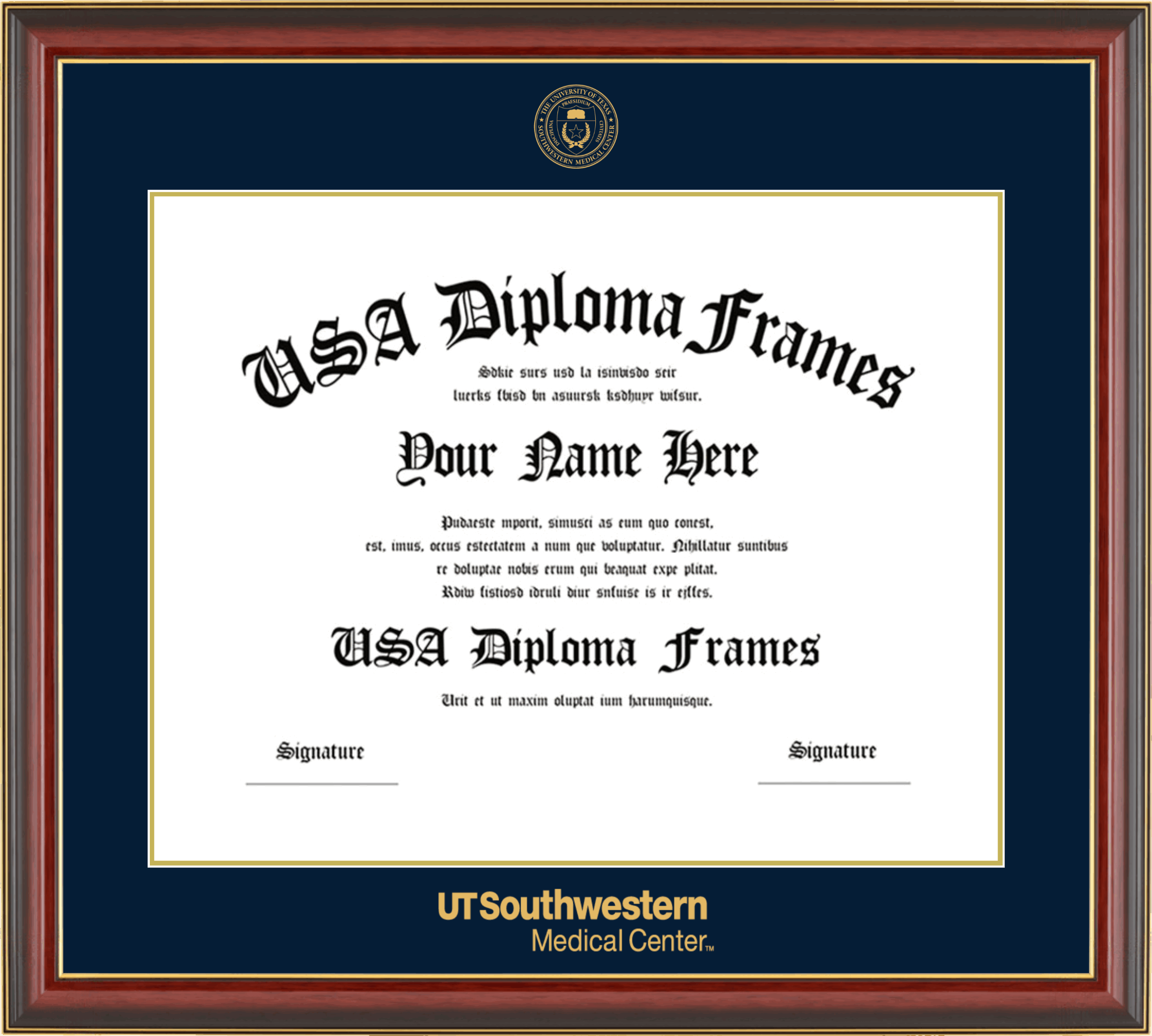 UTSW Diploma Frame – University of Texas Southwestern Medical Center at Dallas – Cherry Mahogany Gold Trim Glossy – Navy Mat – Gold Accent Mat – MD 15.75″ x 20″