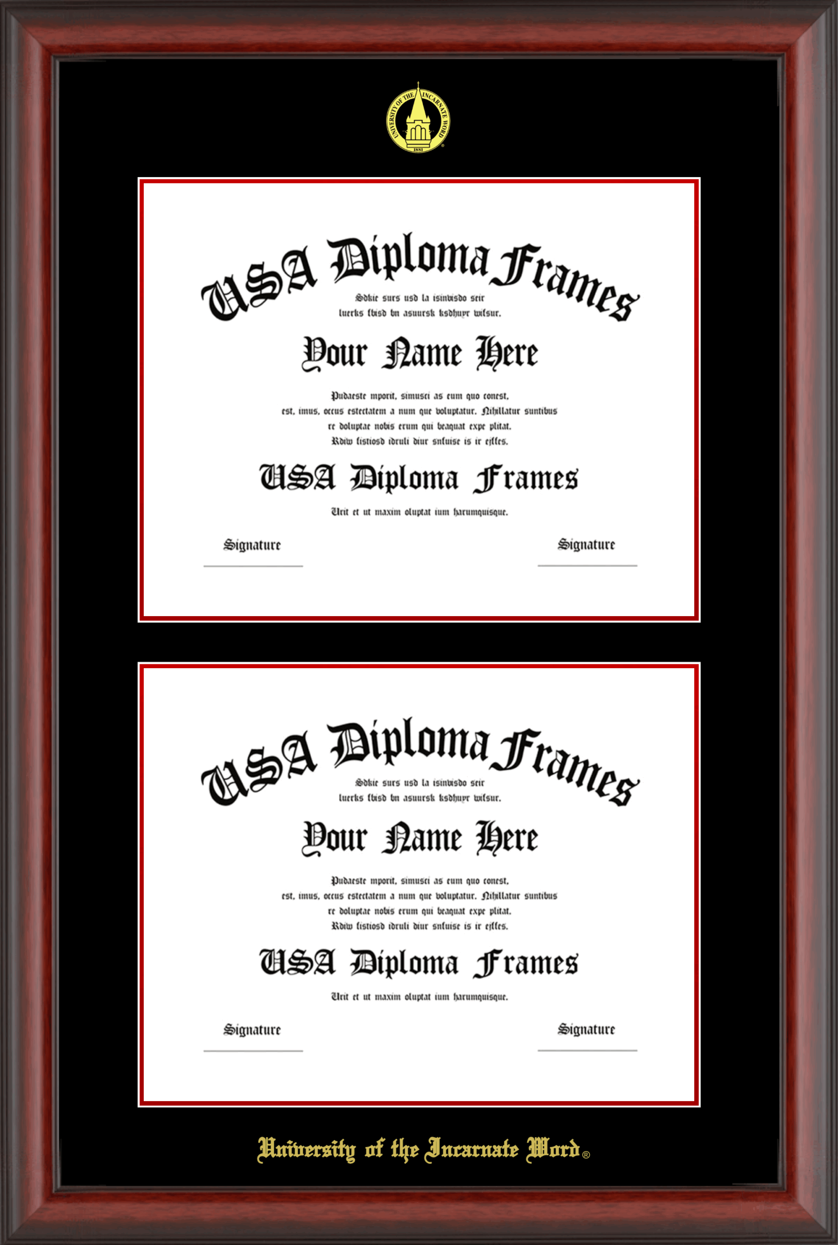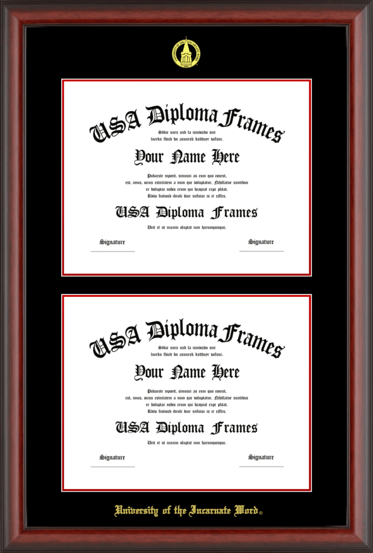 University of the Incarnate Word Double Diploma Frame – Double Document – Cherry Mahogany Matte – Black and Red Mat