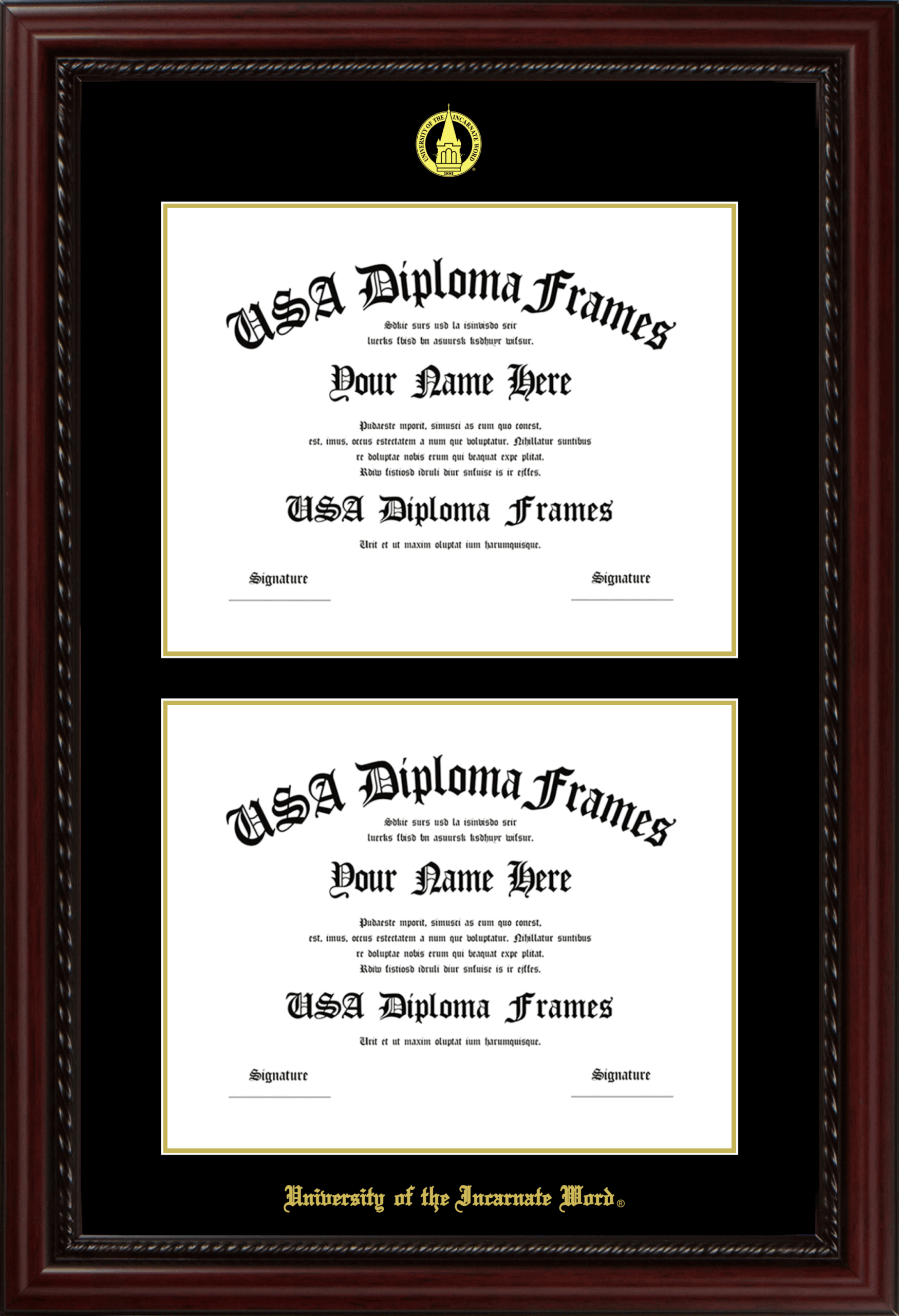 University of the Incarnate Word Double Diploma Frame – Double Document – Executive Cherry Rope – Black and Gold Mat