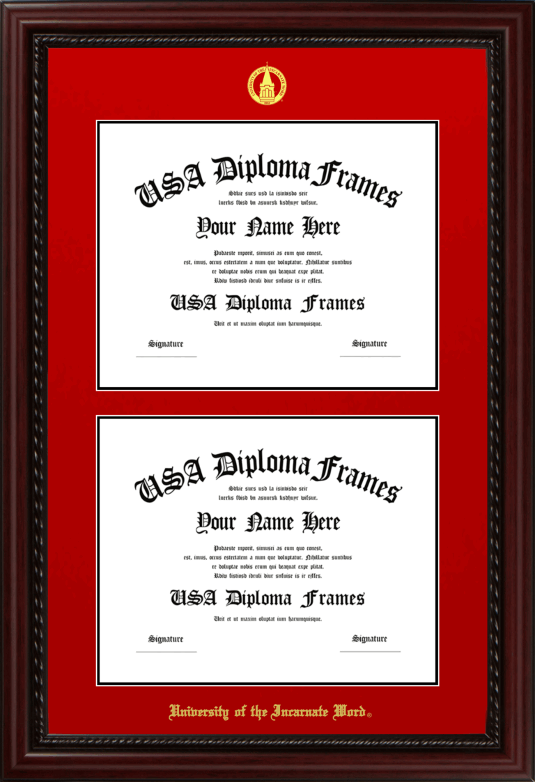 University of the Incarnate Word Double Diploma Frame – Double Document – Executive Cherry Rope – Red and Black Mat