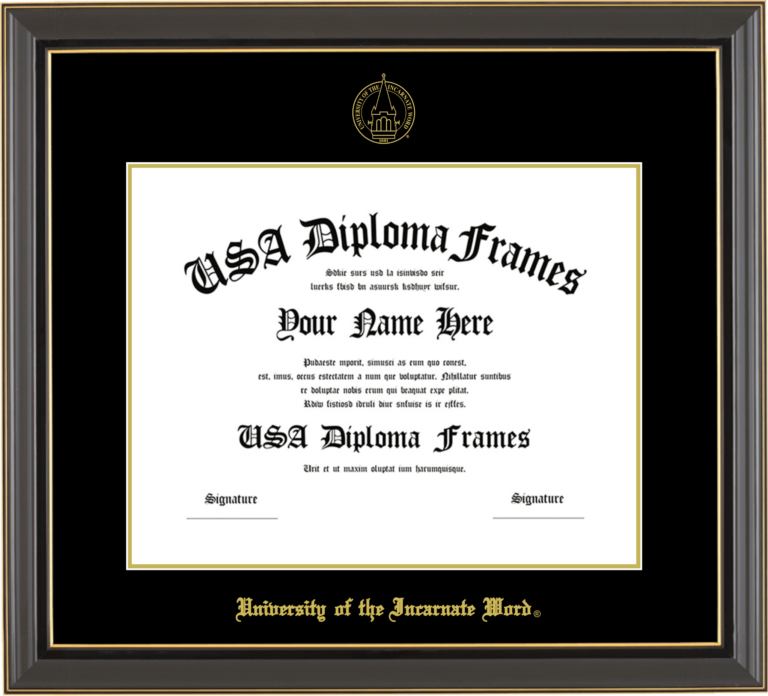 University of the Incarnate Word Diploma Frame – Black Gold Trim Glossy – Black and Gold Mat