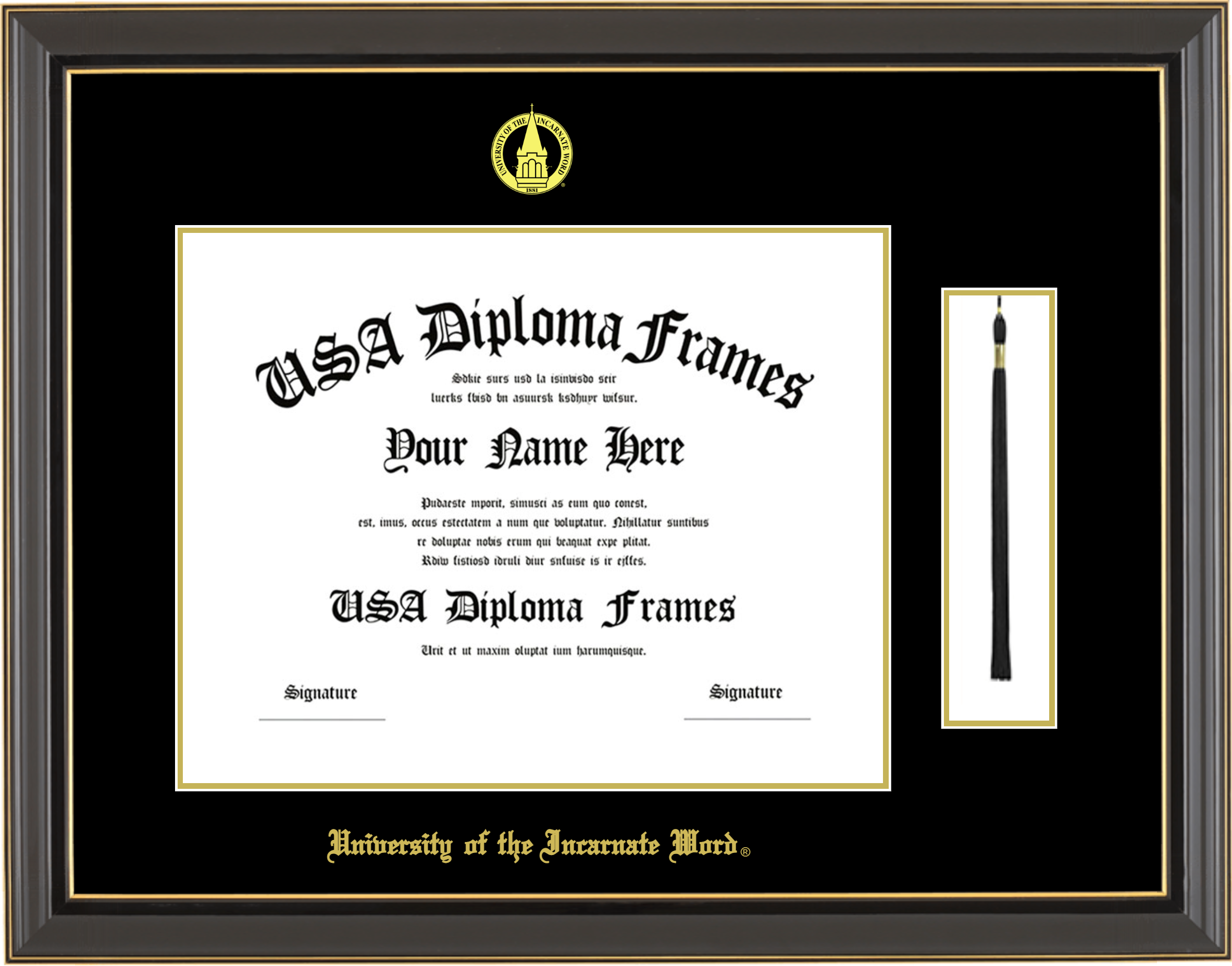 University of the Incarnate Word – Single Horizontal Document ( Diploma ) – Black Gold Trim Glossy – Black Mat – Gold Accent Mat – With Tassel(Default) – With Seal(University Seal Gold) – With Gold Embossing (University of the Incarnate Word)