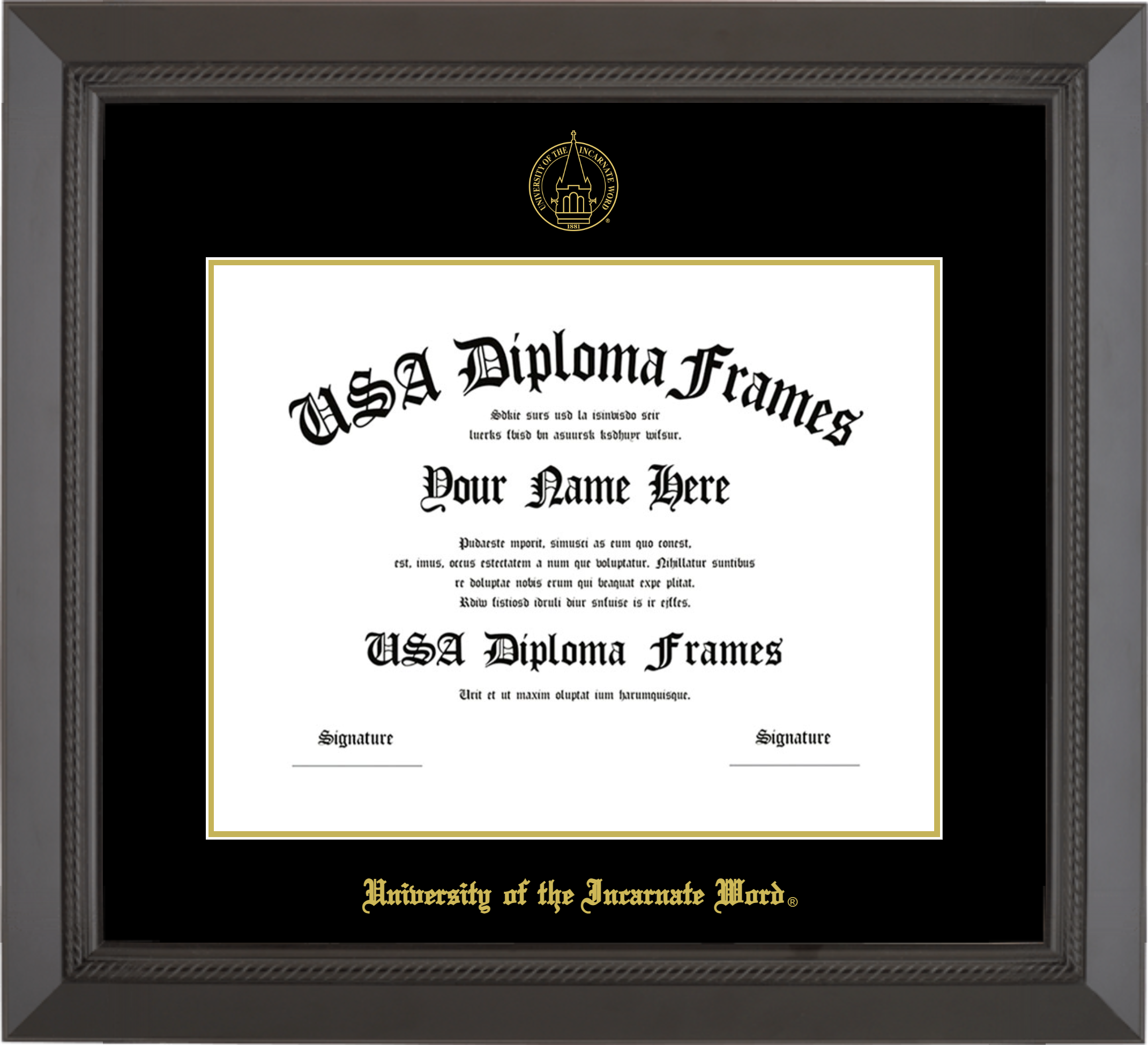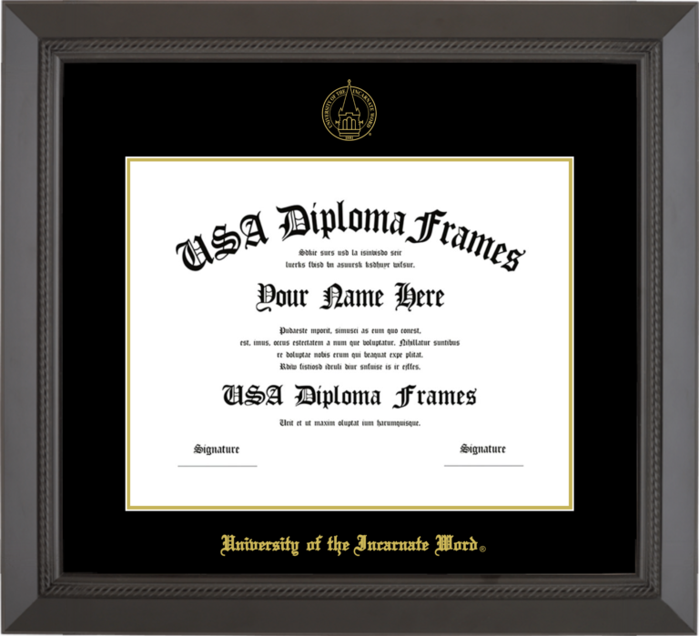 University of the Incarnate Word Diploma Frame – Black Rope – Black and Gold Mat
