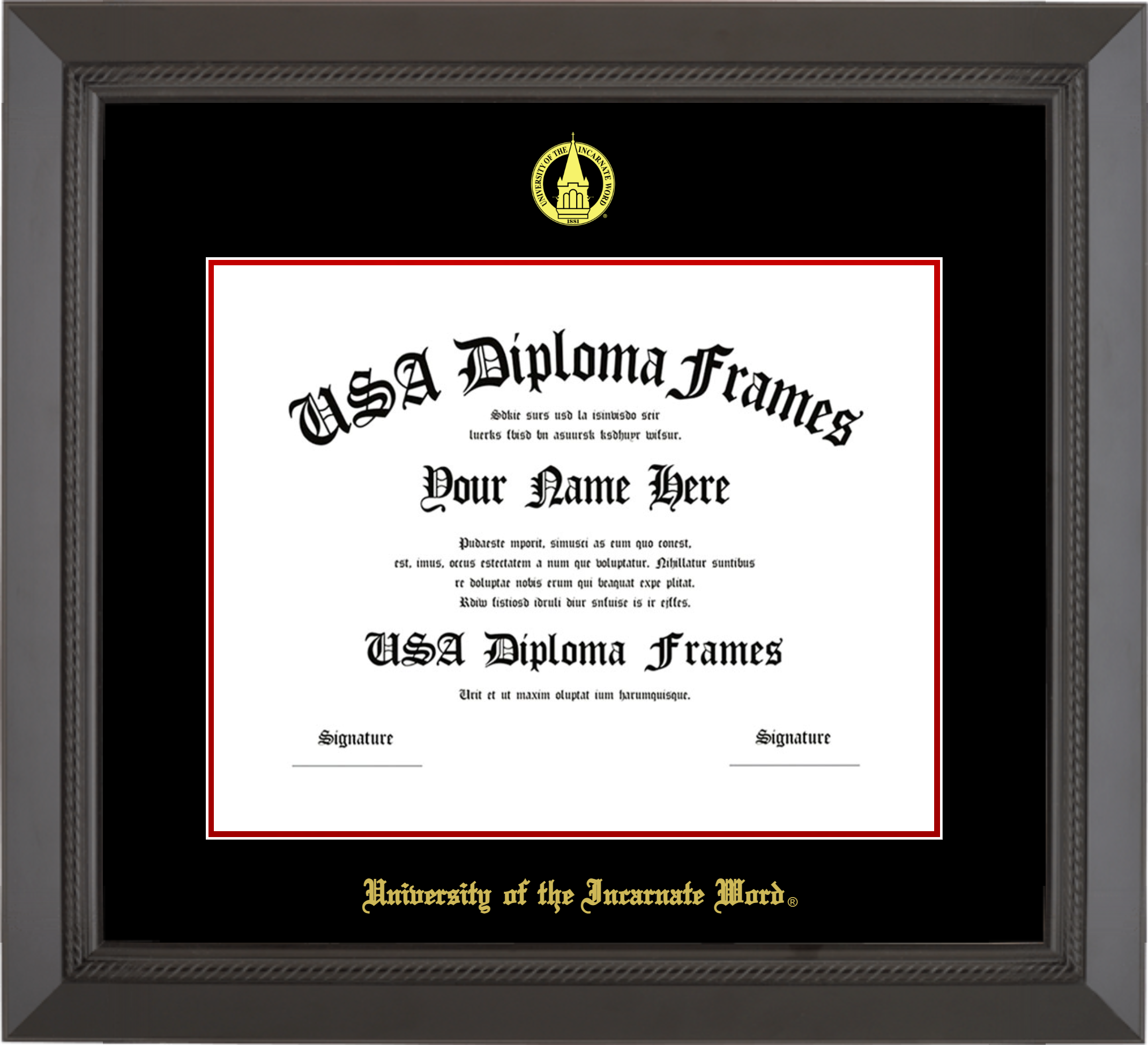 University of the Incarnate Word – Single Horizontal Document ( Diploma ) – Black Rope – Black Mat – Red Accent Mat – With Seal(University Seal Gold) – With Gold Embossing (University of the Incarnate Word)