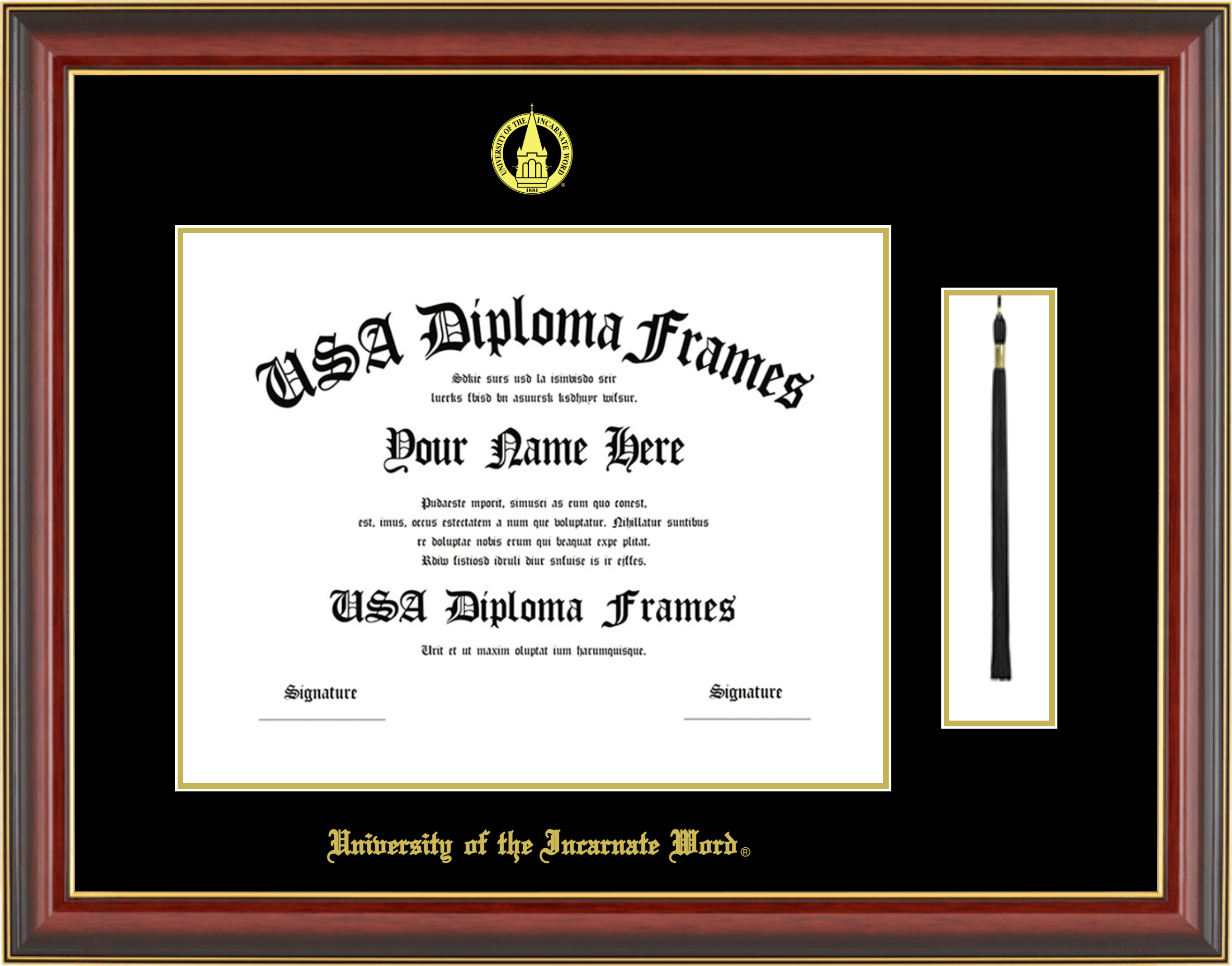 University of the Incarnate Word – Single Horizontal Document ( Diploma ) – Cherry Mahogany Gold Trim Glossy – Black Mat – Gold Accent Mat – With Tassel(Default) – With Seal(University Seal Gold) – With Gold Embossing (University of the Incarnate Word)