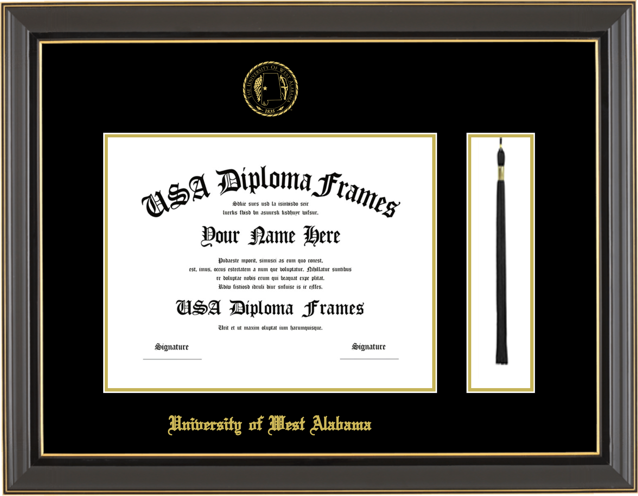 University of West Alabama Diploma Frame with Tassel – Black Gold Trim Glossy – Black and Gold Mat