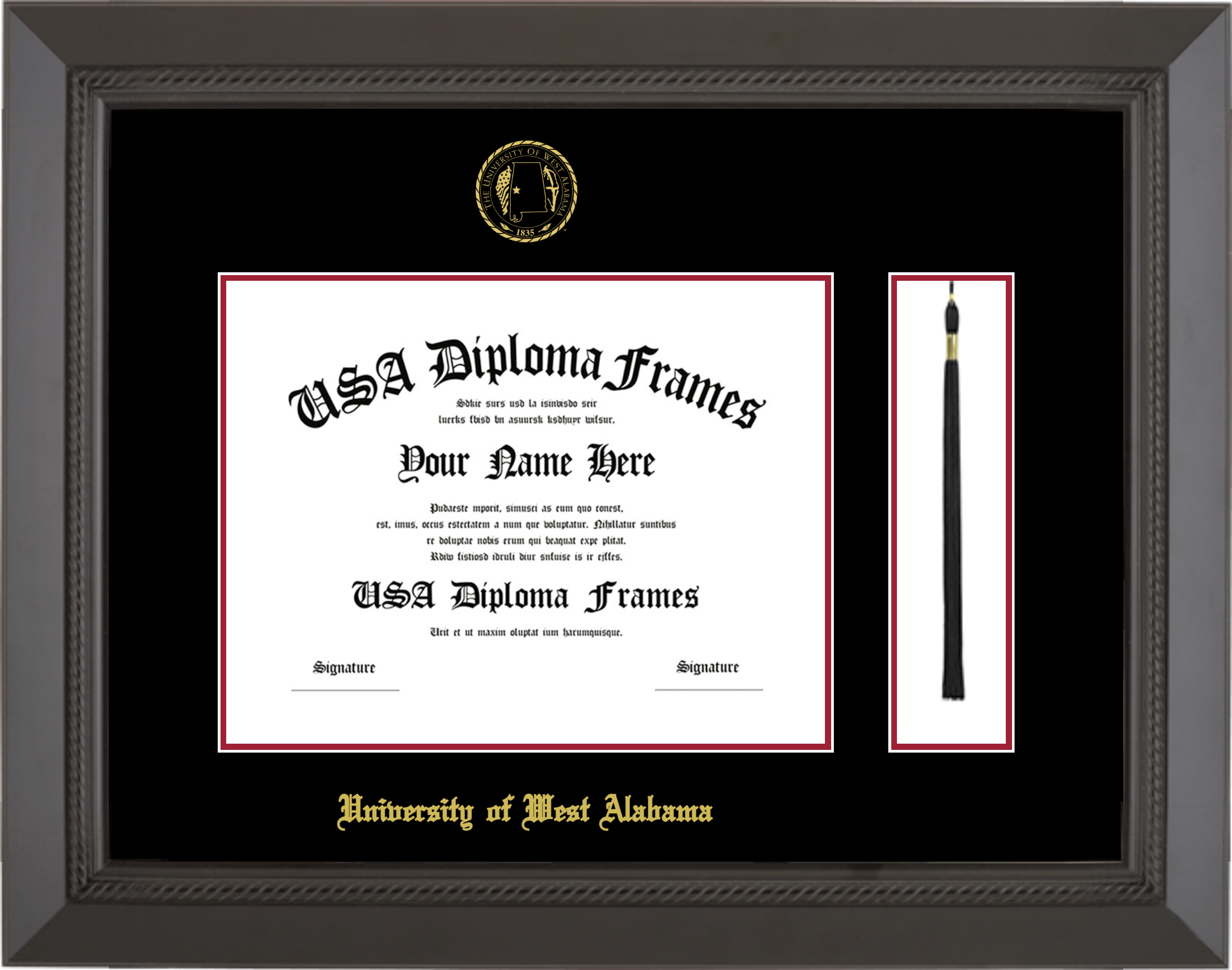University of West Alabama Diploma Frame with Tassel – Black Rope – Black and Crimson Mat