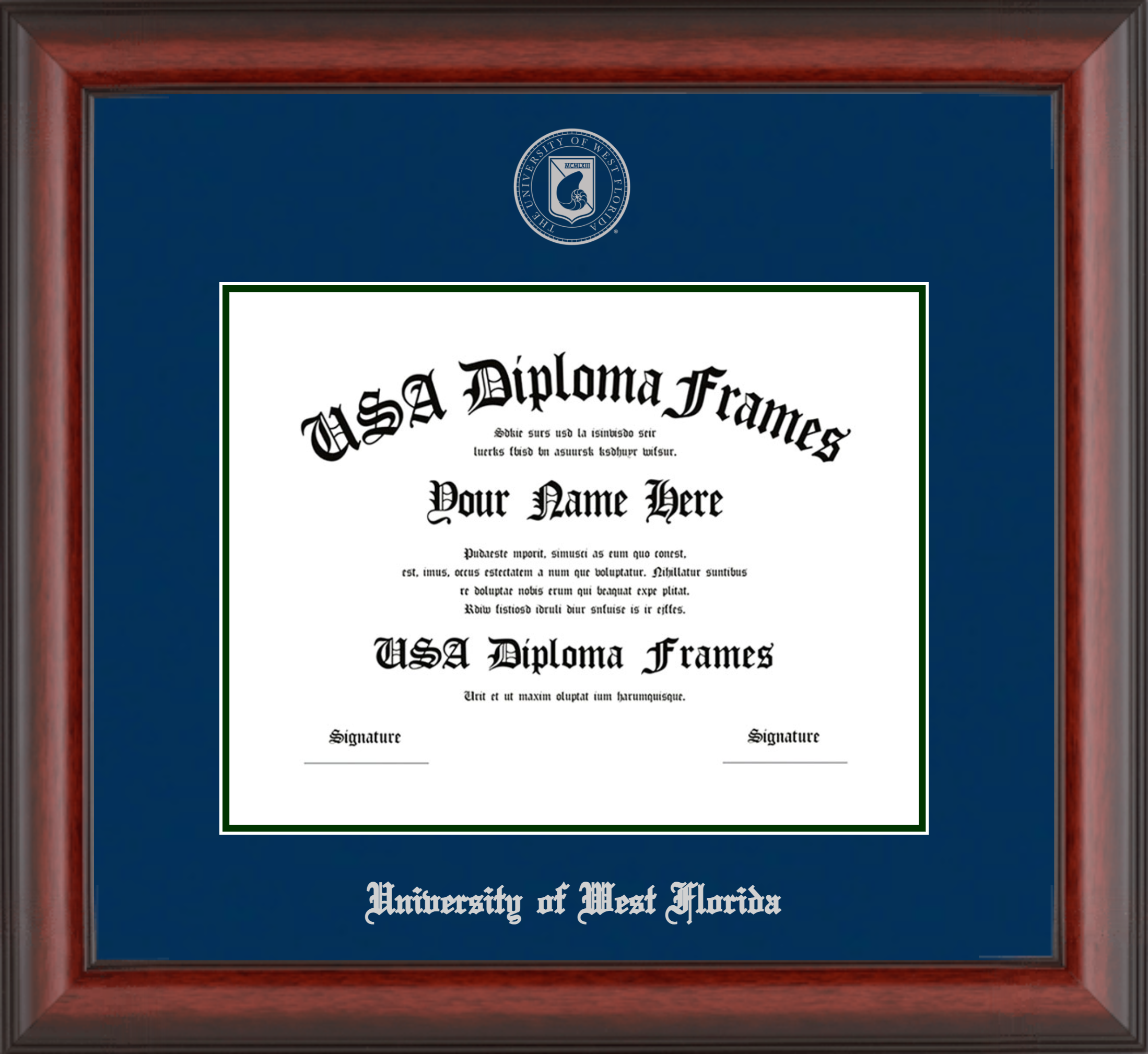 University of West Florida Diploma Frame – Cherry Mahogany Matte – Navy and Winter Green Mat