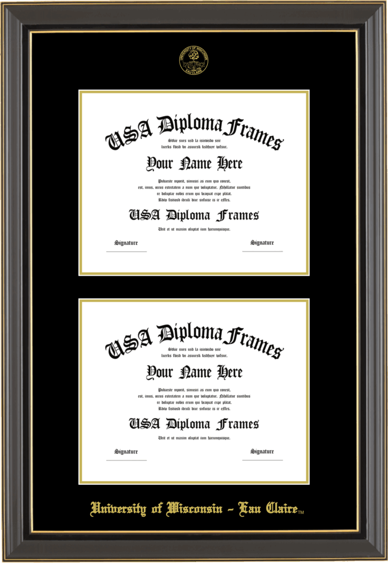 University of Wisconsin – Eau Claire Double Diploma Frame – Double Document – Black Gold Trim Glossy – Black and Gold Mat
