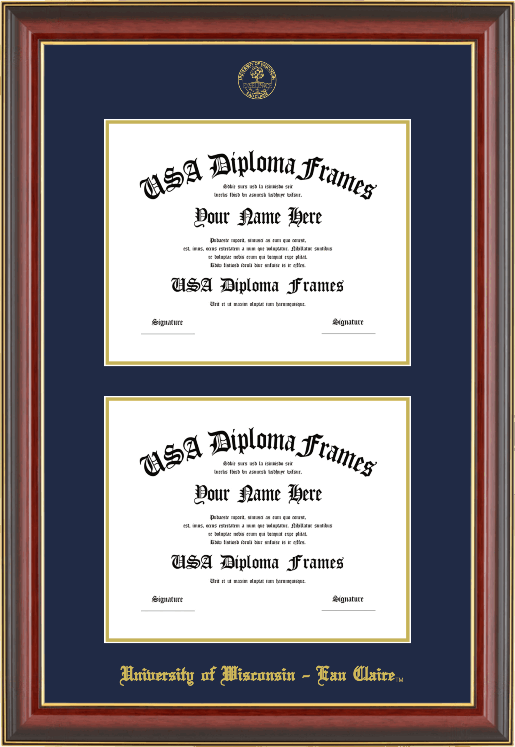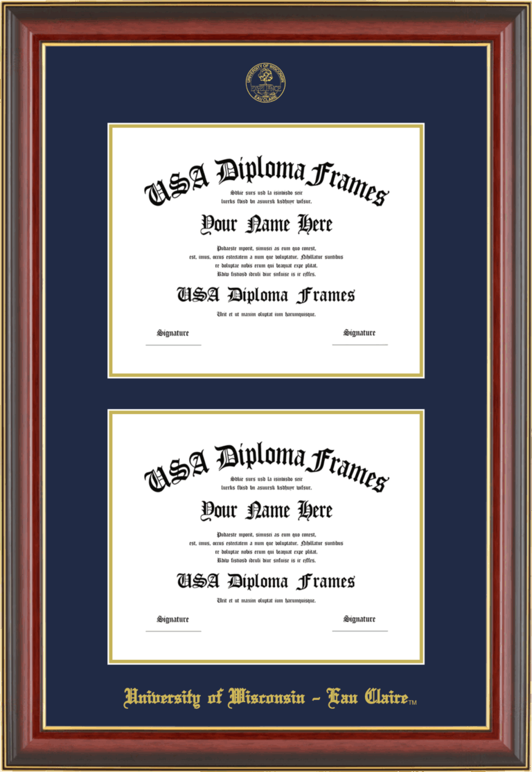 University of Wisconsin – Eau Claire Double Diploma Frame – Double Document – Cherry Mahogany Gold Trim Glossy – Navy and Gold Mat