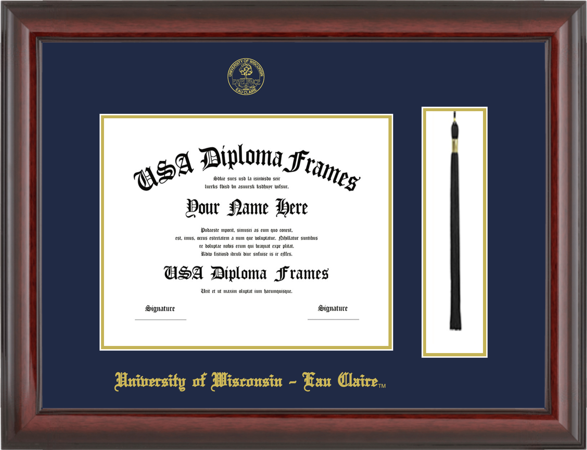 University of Wisconsin – Eau Claire – Single Horizontal Document ( Diploma ) – Cherry Mahogany Glossy – Navy Mat – Gold Accent Mat – With Tassel(Default) – With Seal(University Seal Gold) – With Gold Embossing (University of Wisconsin – Eau Claire)