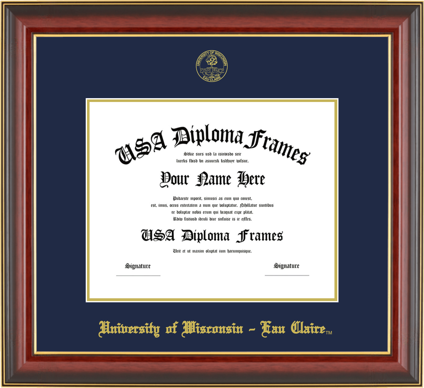 University of Wisconsin – Eau Claire – Single Horizontal Document ( Diploma ) – Cherry Mahogany Gold Trim Glossy – Navy Mat – Gold Accent Mat – With Seal(University Seal Gold) – With Gold Embossing (University of Wisconsin – Eau Claire)