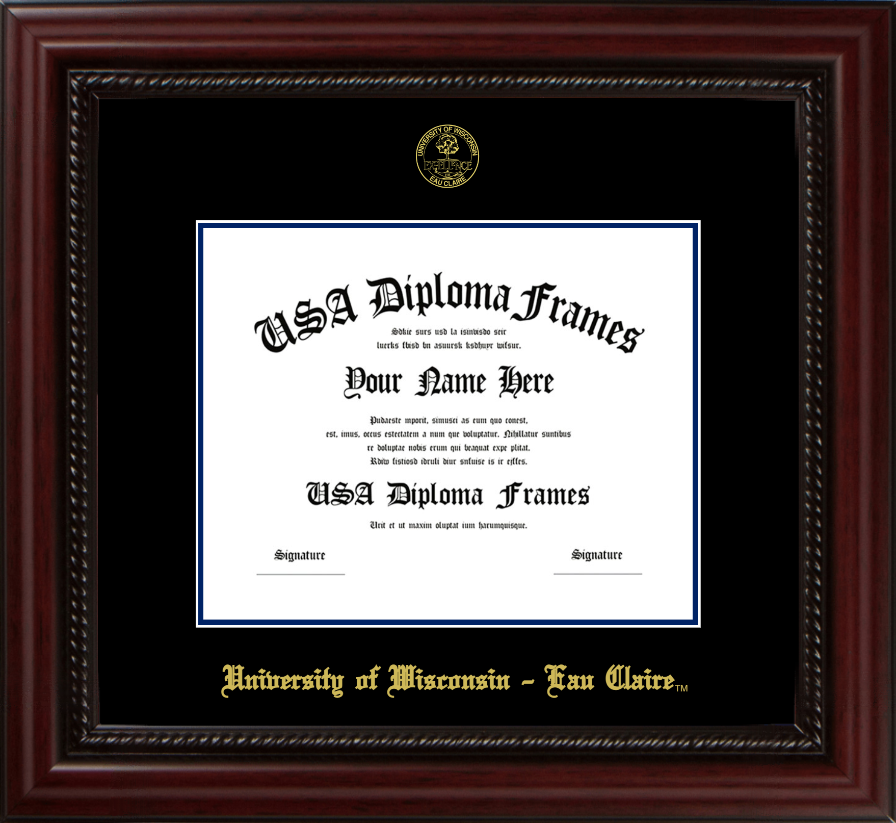 University of Wisconsin – Eau Claire – Single Horizontal Document ( Diploma ) – Executive Cherry Rope – Black Mat – Navy Accent Mat – With Seal(University Seal Gold) – With Gold Embossing (University of Wisconsin – Eau Claire)