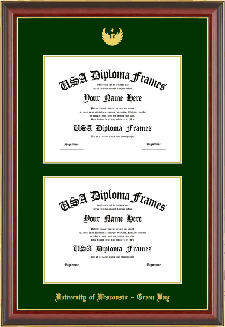 University of Wisconsin – Green Bay Double Diploma Frame – Double Document – Cherry Mahogany Gold Trim Glossy – Winter Green and Gold Mat