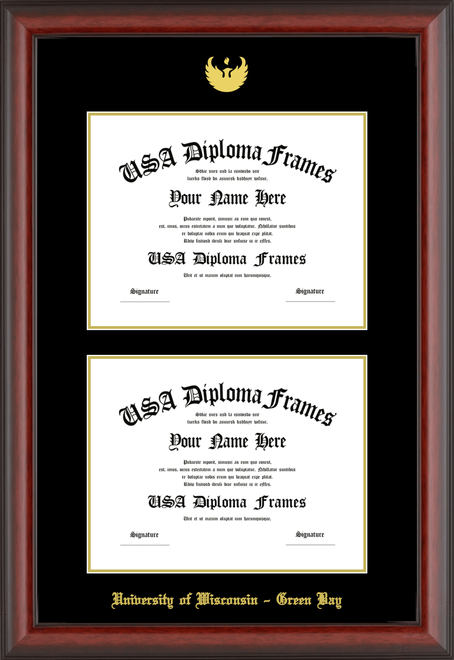 University of Wisconsin – Green Bay Double Diploma Frame – Double Document – Cherry Mahogany Matte – Black and Gold Mat