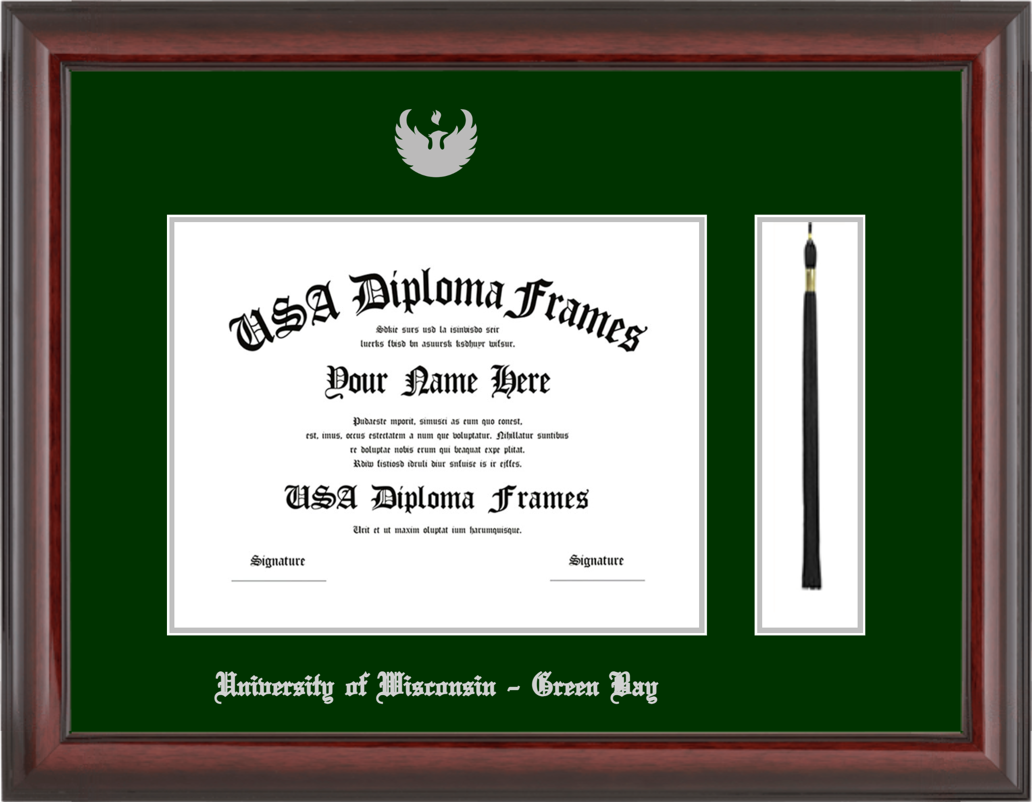 University of Wisconsin – Green Bay Diploma Frame with Tassel – Cherry Mahogany Glossy – Winter Green and Silver Mat