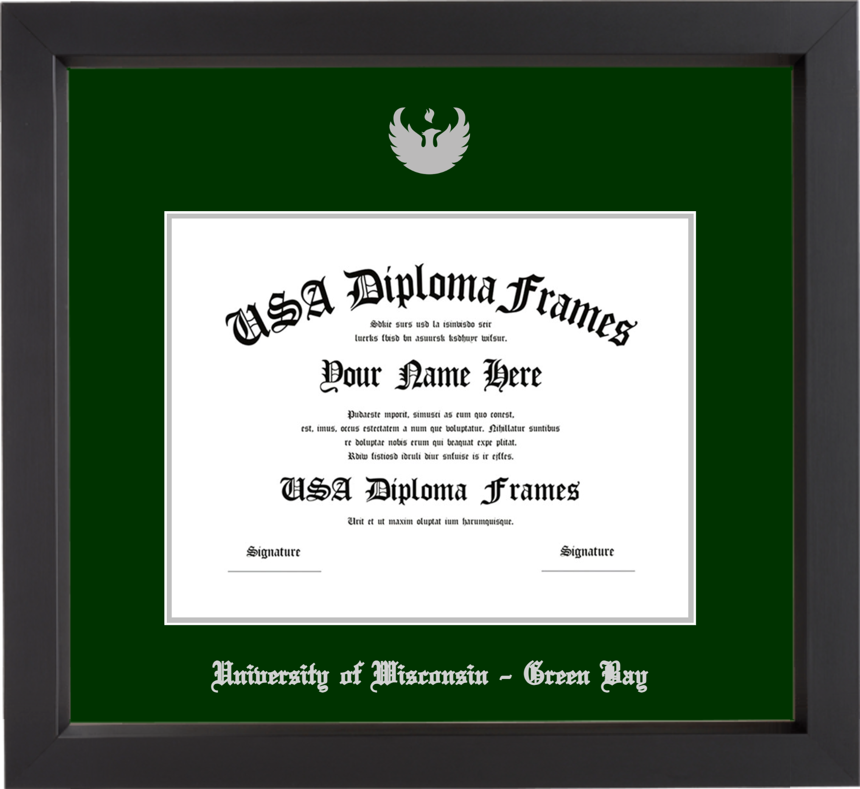 University of Wisconsin – Green Bay – Single Horizontal Document ( Diploma ) – Black Matte – Winter Green Mat – Silver Accent Mat – With Seal(University Seal Silver) – With Silver Embossing (University of Wisconsin – Green Bay)