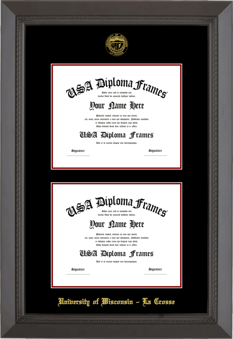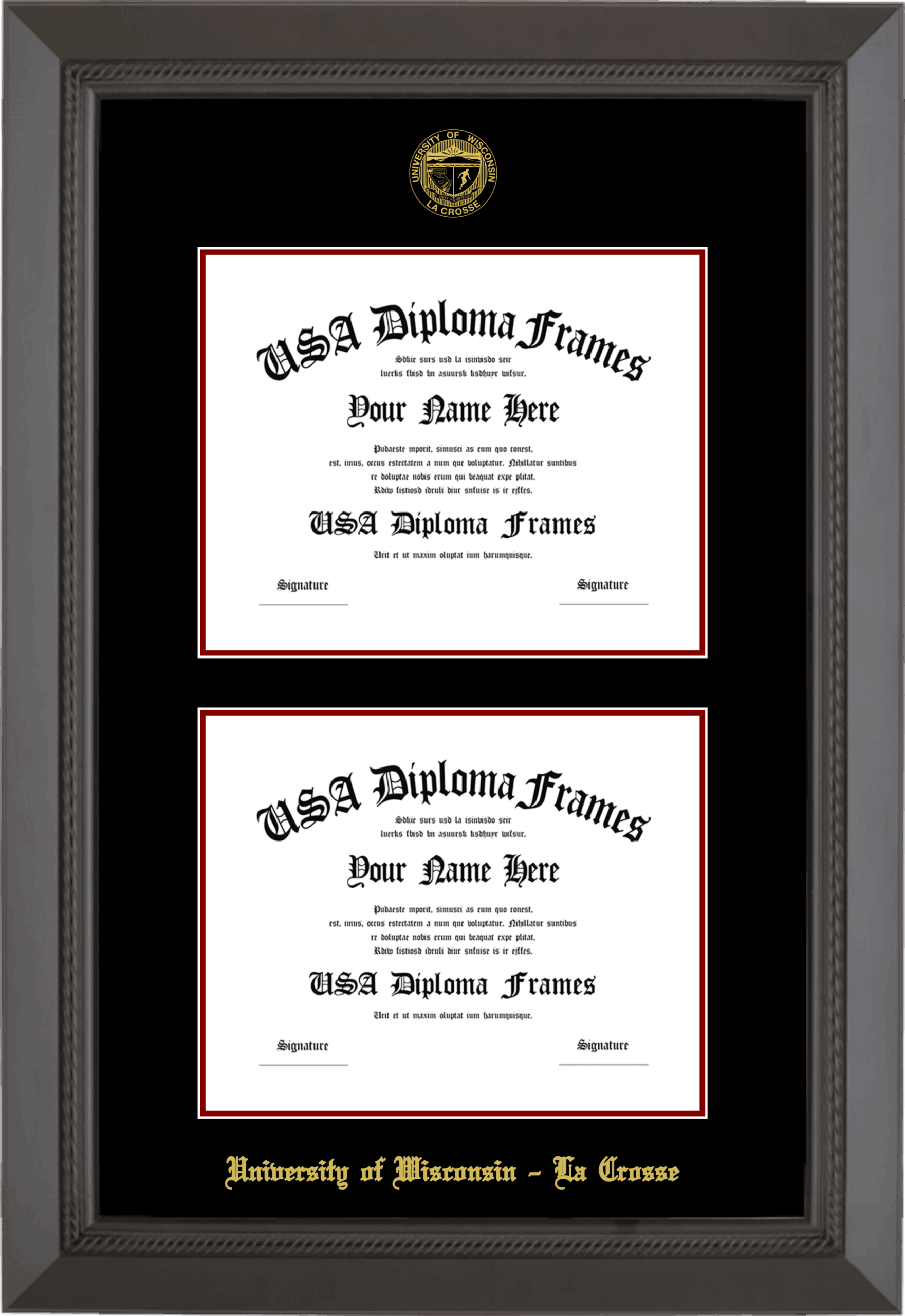 University of Wisconsin – La Crosse Double Diploma Frame – Double Document – Black Rope – Black and Maroon Mat
