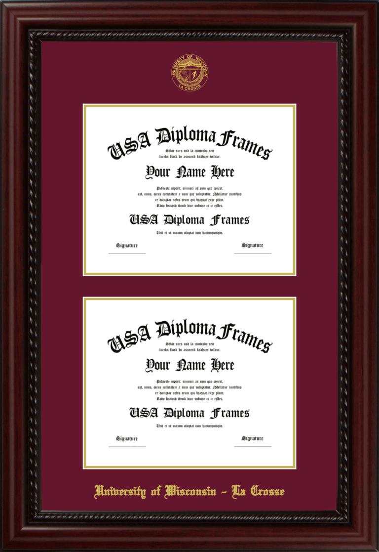 University of Wisconsin – La Crosse Double Diploma Frame – Double Document – Executive Cherry Rope – Maroon and Gold Mat