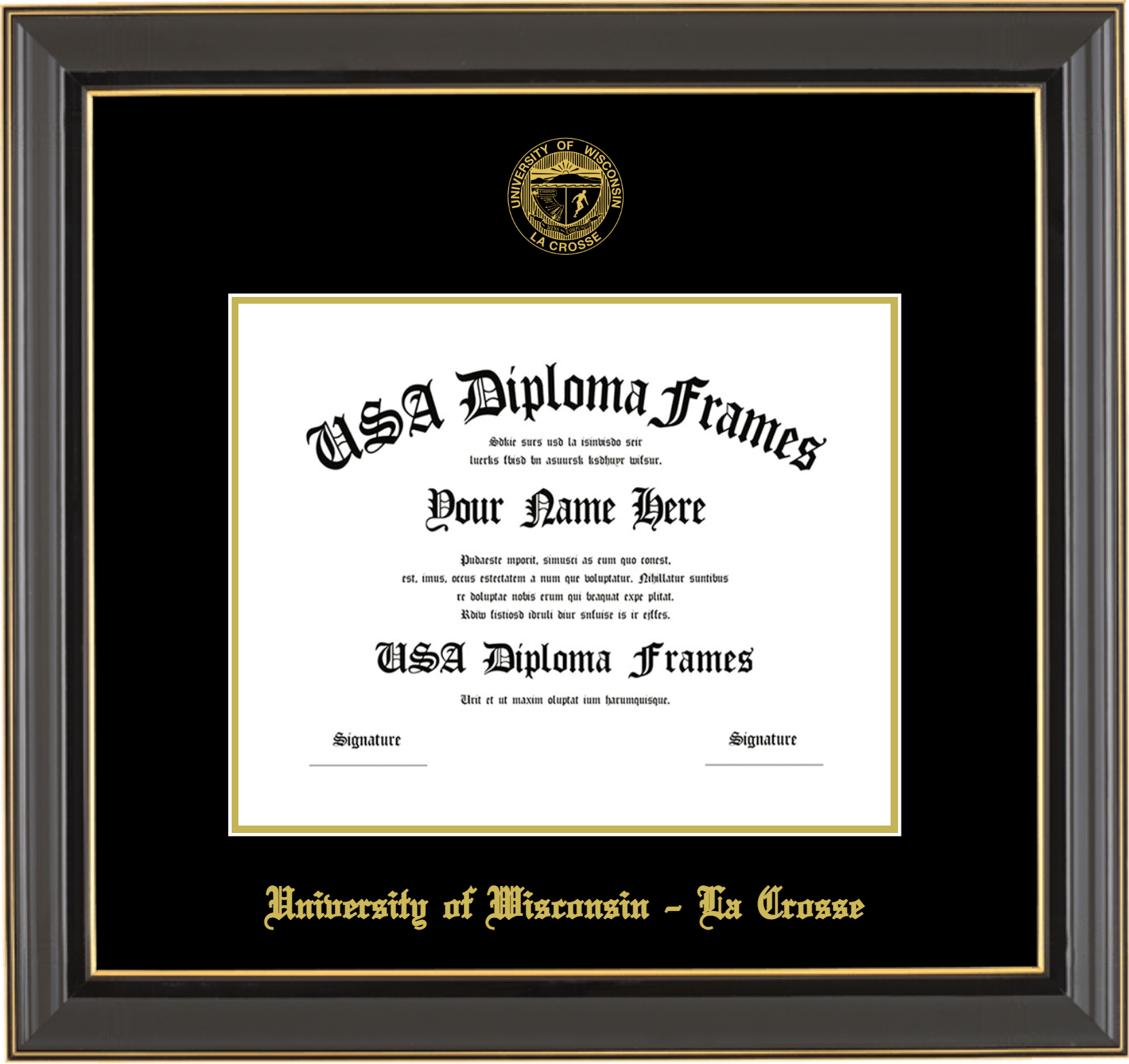 University of Wisconsin – La Crosse – Single Horizontal Document ( Diploma ) – Black Gold Trim Glossy – Black Mat – Gold Accent Mat – With Seal(University Seal Gold) – With Gold Embossing (University of Wisconsin – La Crosse)