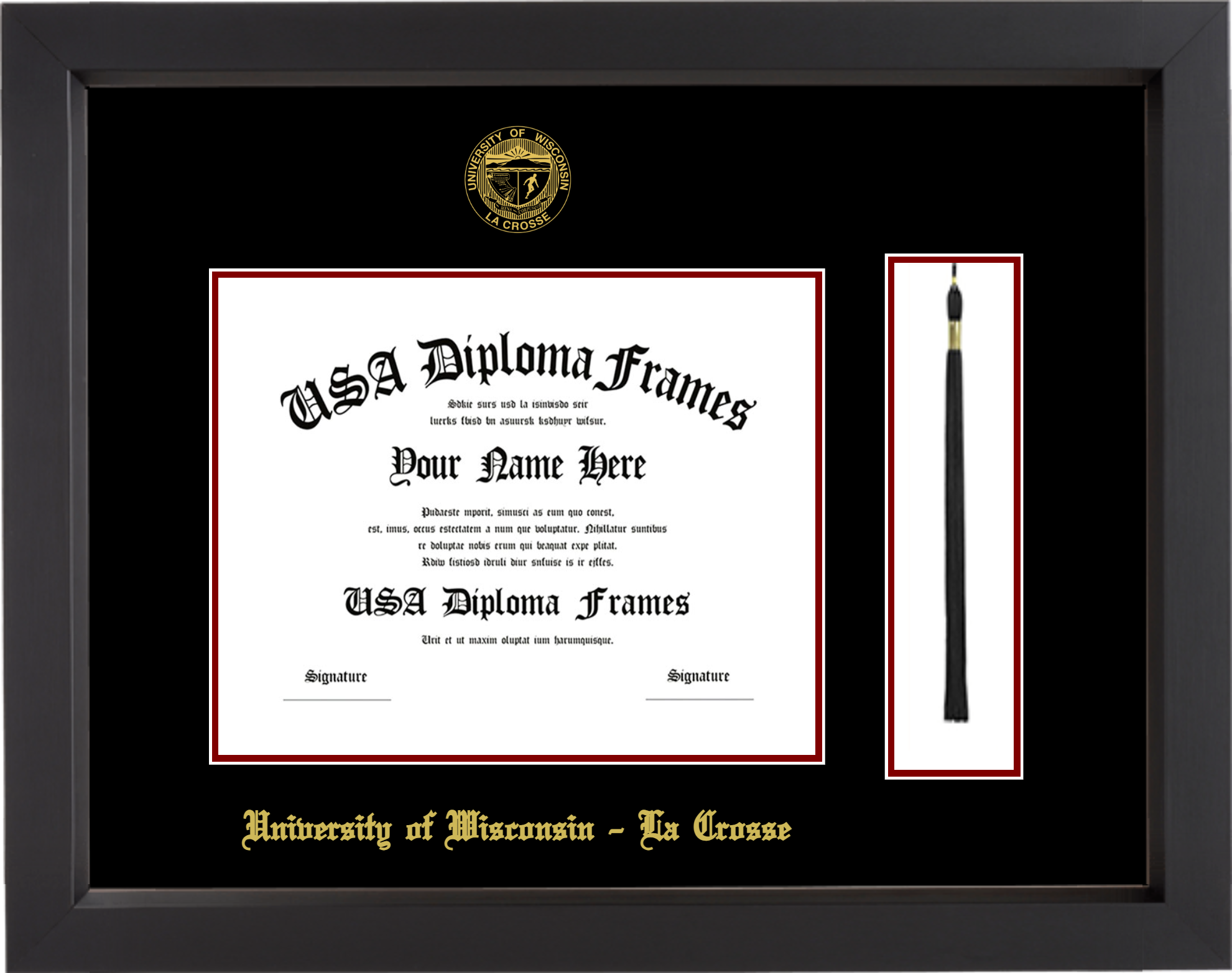 University of Wisconsin – La Crosse – Single Horizontal Document ( Diploma ) – Black Matte – Black Mat – Maroon Accent Mat – With Tassel(Default) – With Seal(University Seal Gold) – With Gold Embossing (University of Wisconsin – La Crosse)