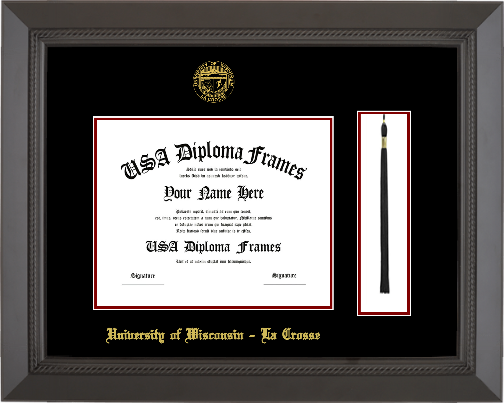 University of Wisconsin – La Crosse – Single Horizontal Document ( Diploma ) – Black Rope – Black Mat – Maroon Accent Mat – With Tassel(Default) – With Seal(University Seal Gold) – With Gold Embossing (University of Wisconsin – La Crosse)