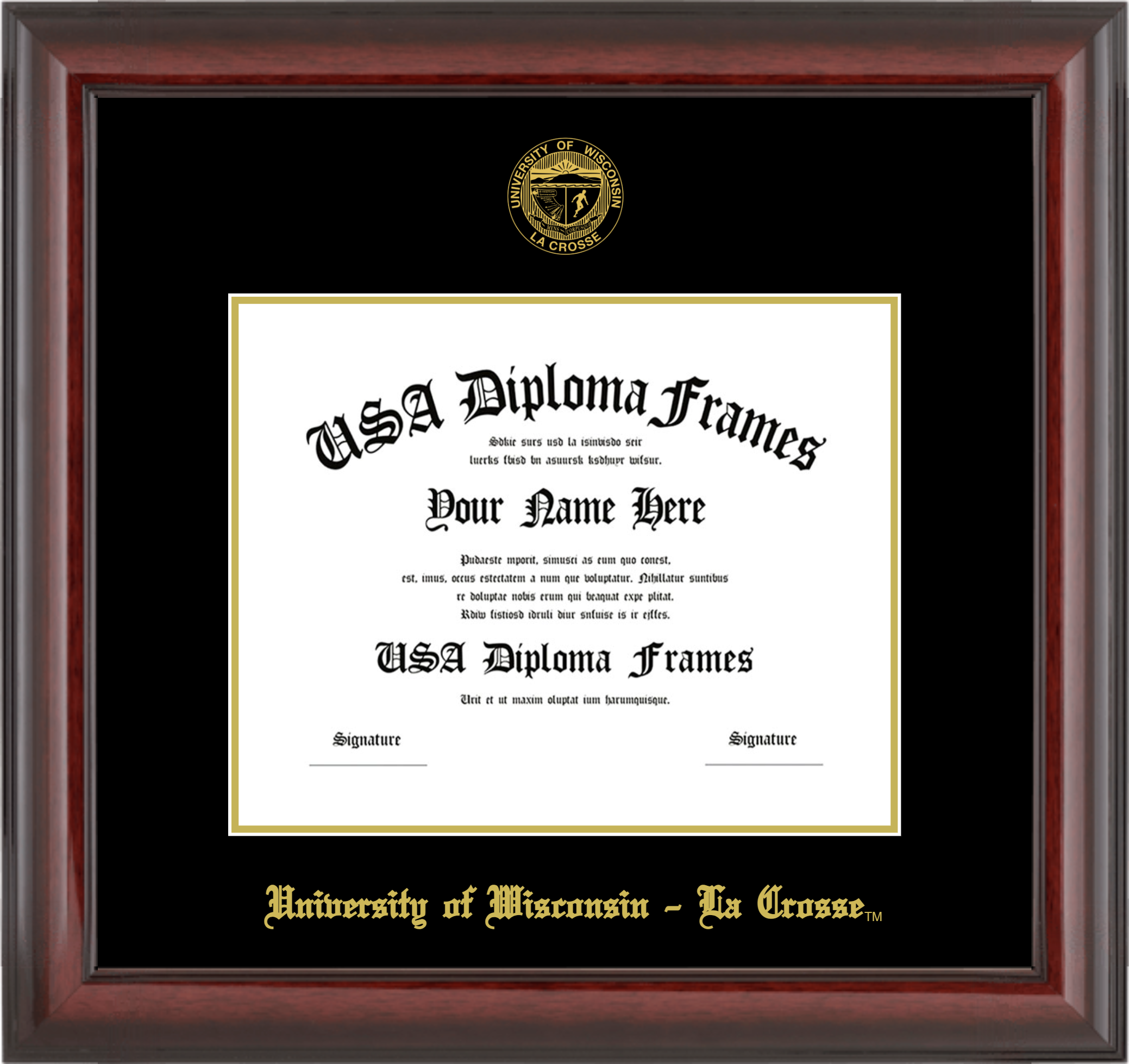 University of Wisconsin – La Crosse Diploma Frame – Cherry Mahogany Glossy – Black and Gold Mat