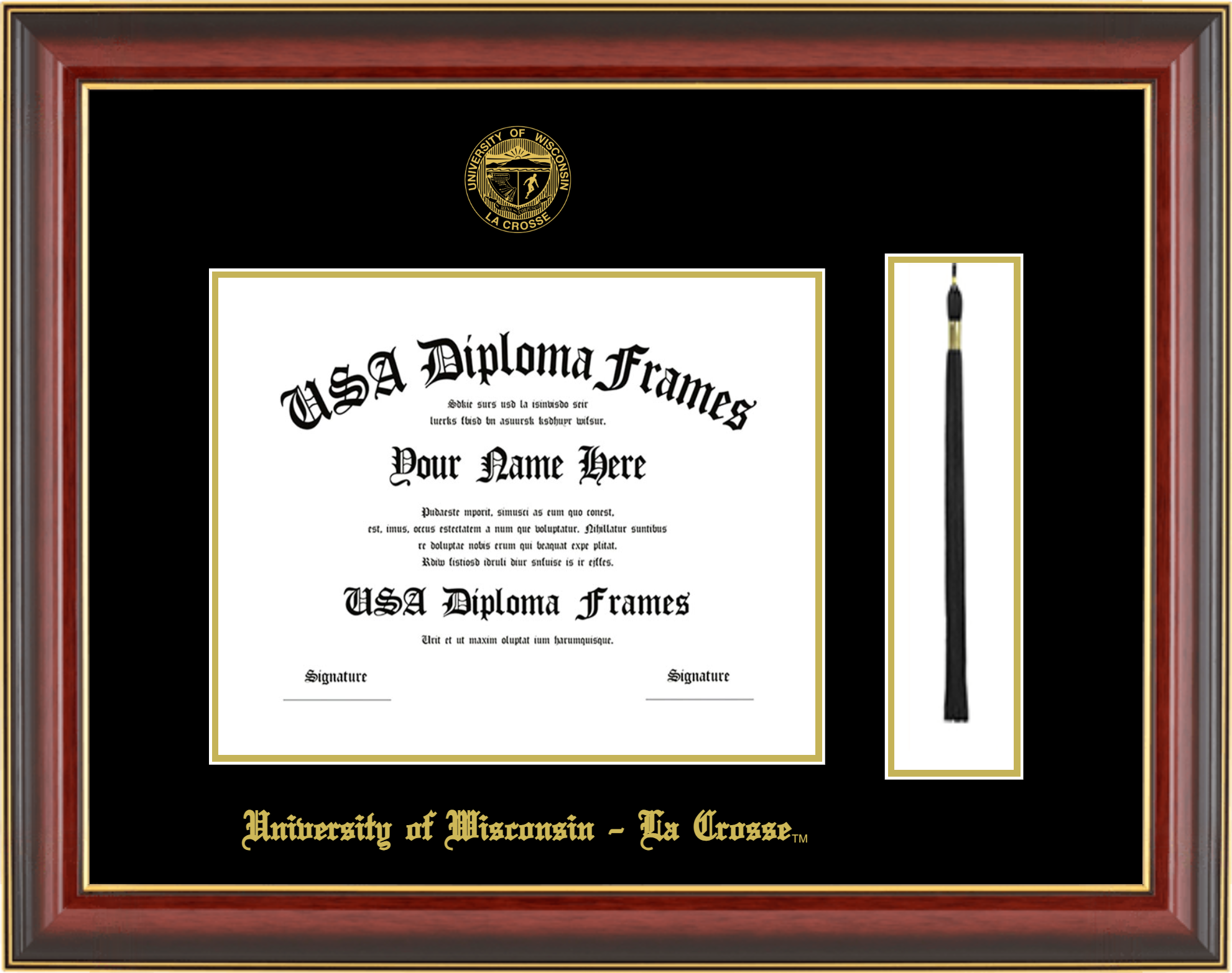 University of Wisconsin – La Crosse – Single Horizontal Document ( Diploma ) – Cherry Mahogany Gold Trim Glossy – Black Mat – Gold Accent Mat – With Tassel(Default) – With Seal(University Seal Gold) – With Gold Embossing (University of Wisconsin – La Crosse)
