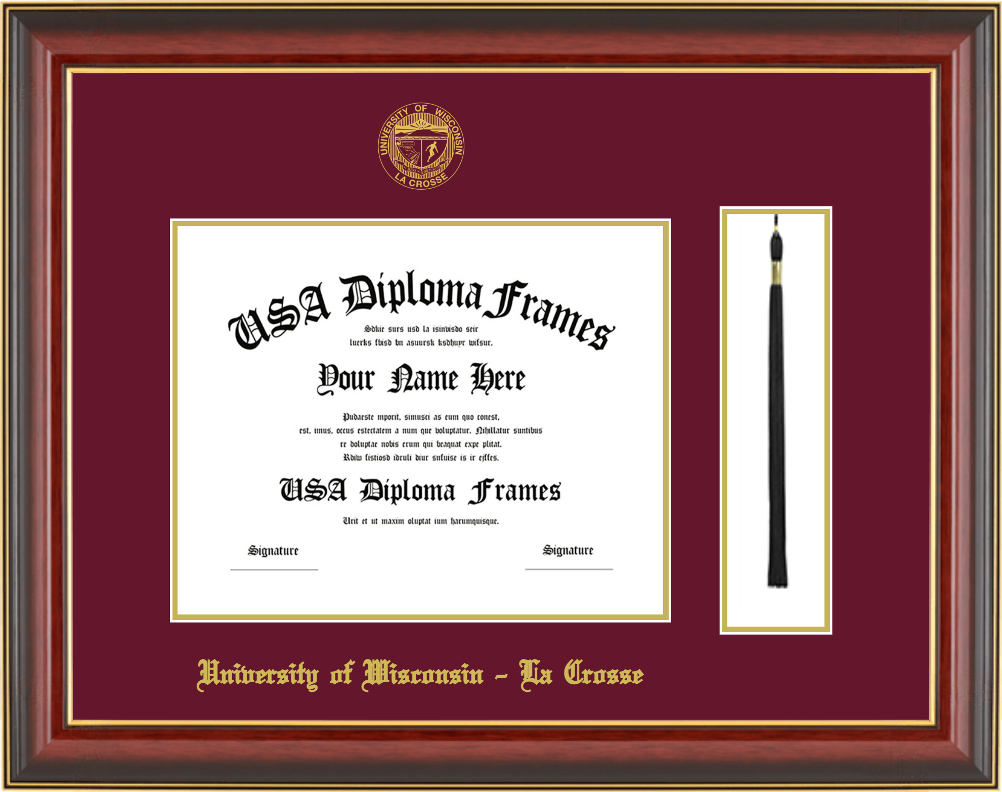 University of Wisconsin – La Crosse – Single Horizontal Document ( Diploma ) – Cherry Mahogany Gold Trim Glossy – Maroon Mat – Gold Accent Mat – With Tassel(Default) – With Seal(University Seal Gold) – With Gold Embossing (University of Wisconsin – La Crosse)