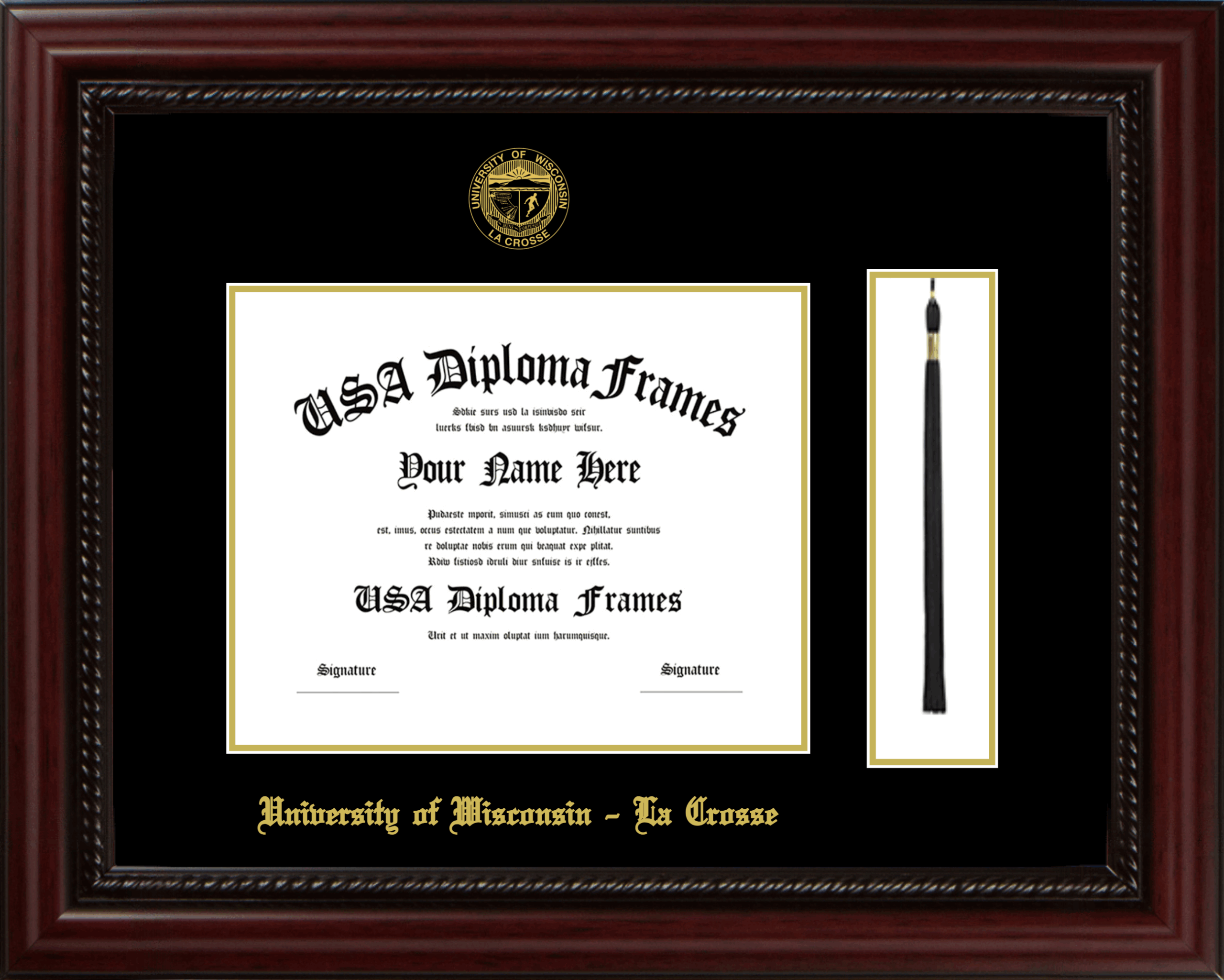 University of Wisconsin – La Crosse – Single Horizontal Document ( Diploma ) – Executive Cherry Rope – Black Mat – Gold Accent Mat – With Tassel(Default) – With Seal(University Seal Gold) – With Gold Embossing (University of Wisconsin – La Crosse)