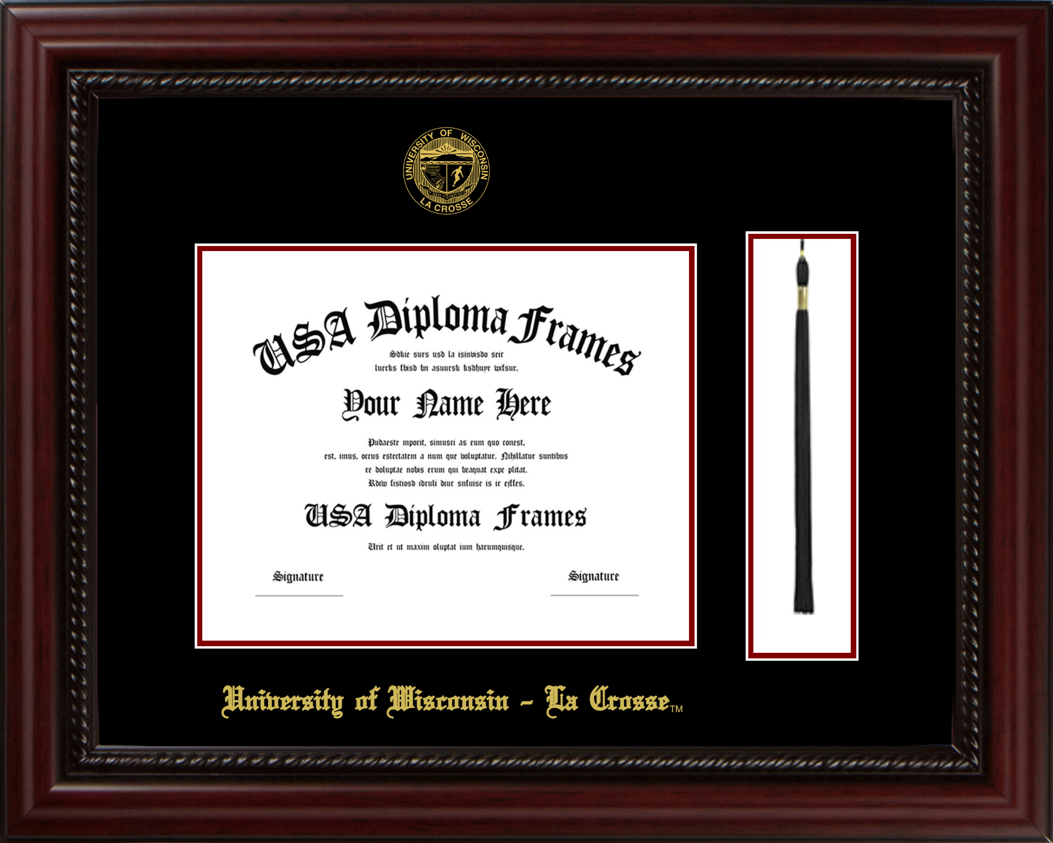 University of Wisconsin – La Crosse – Single Horizontal Document ( Diploma ) – Executive Cherry Rope – Black Mat – Maroon Accent Mat – With Tassel(Default) – With Seal(University Seal Gold) – With Gold Embossing (University of Wisconsin – La Crosse)