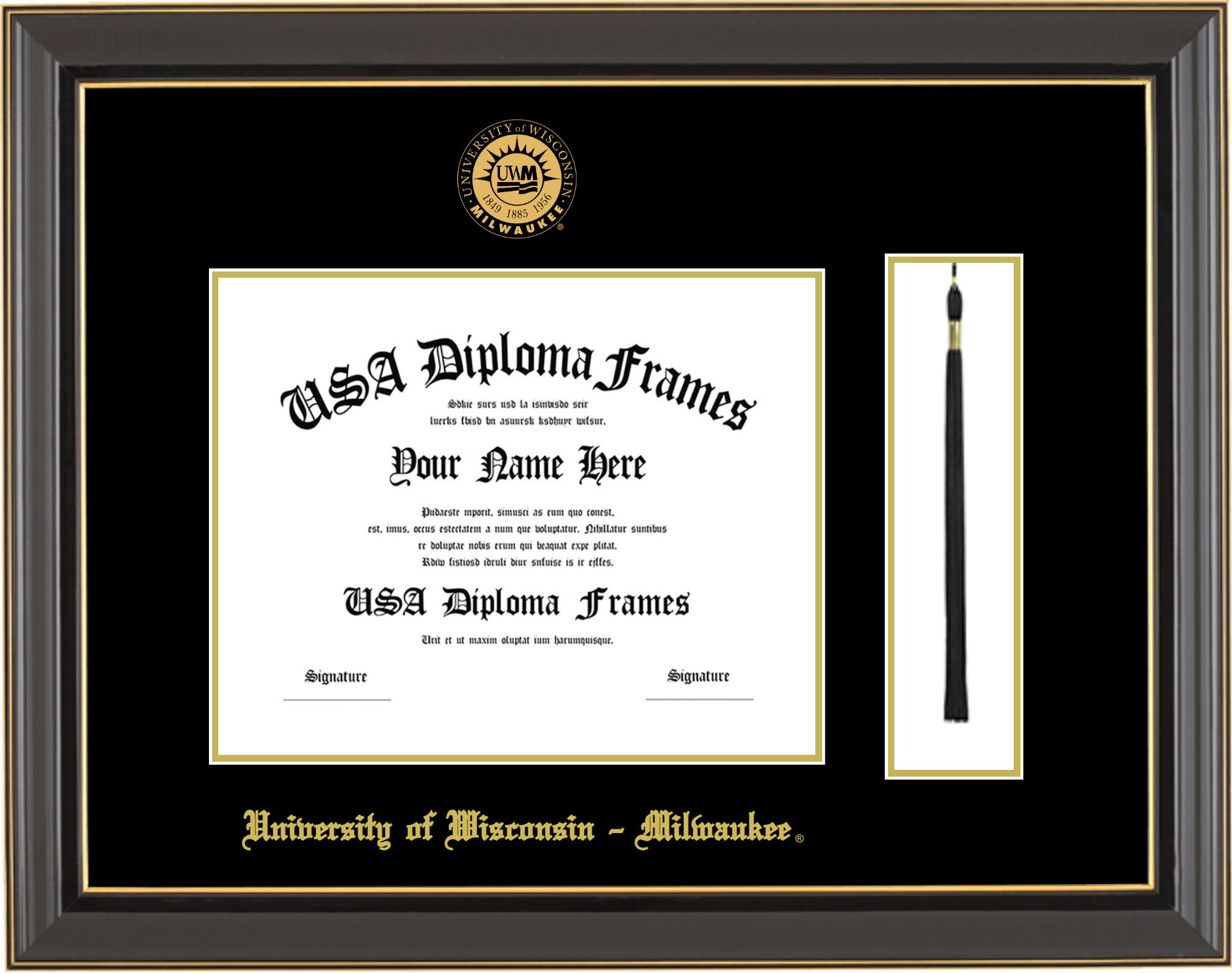 University of Wisconsin – Milwaukee Diploma Frame with Tassel – Black Gold Trim Glossy – Black and Gold Mat