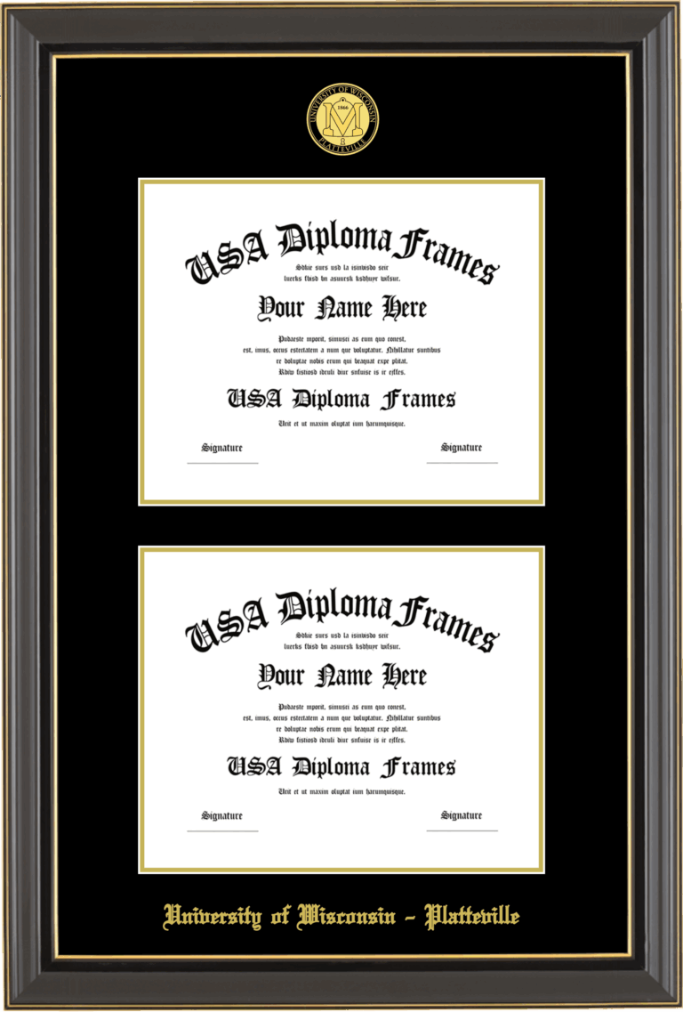 University of Wisconsin – Platteville Double Diploma Frame – Double Document – Black Gold Trim Glossy – Black and Gold Mat