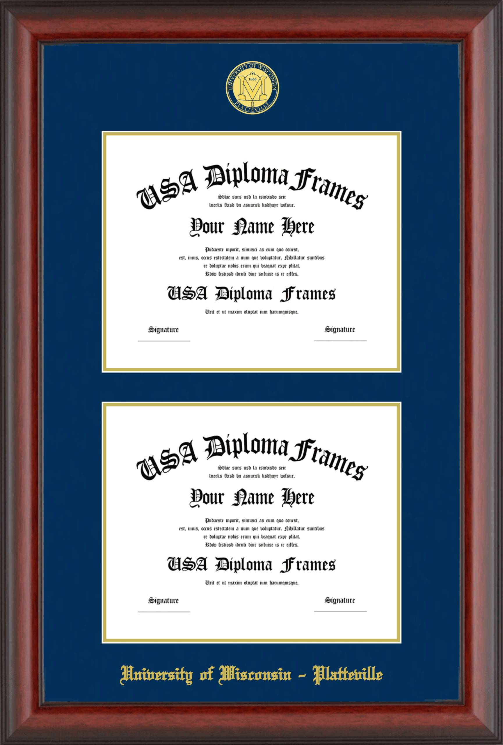 University of Wisconsin – Platteville Double Diploma Frame – Double Document – Cherry Mahogany Matte – Navy and Gold Mat