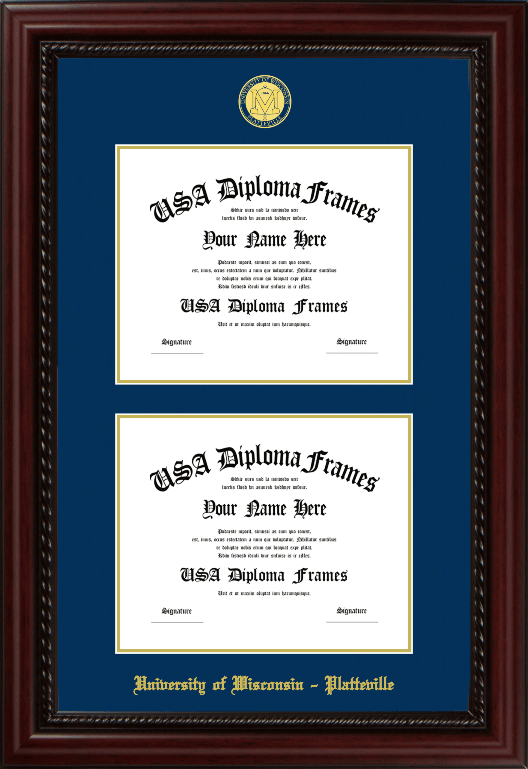 University of Wisconsin – Platteville Double Diploma Frame – Double Document – Executive Cherry Rope – Navy and Gold Mat